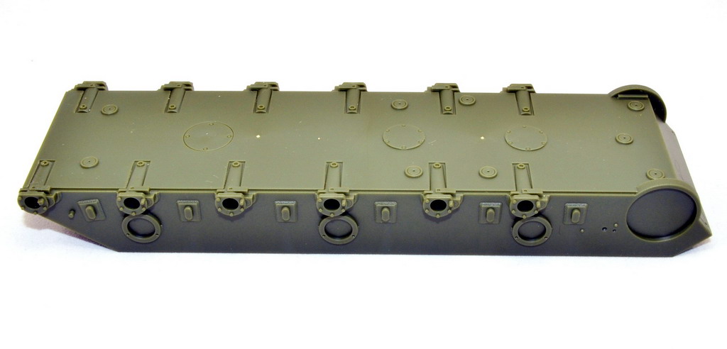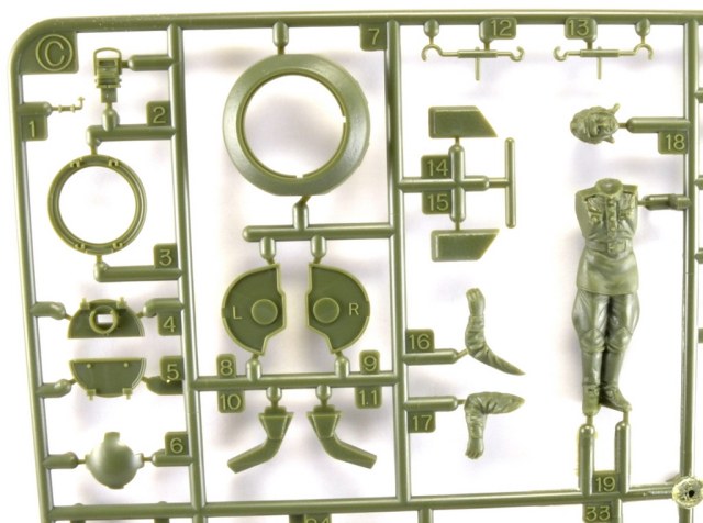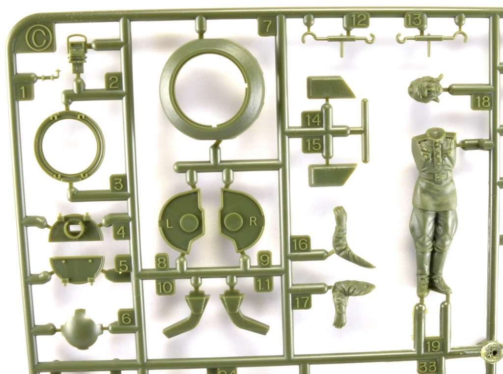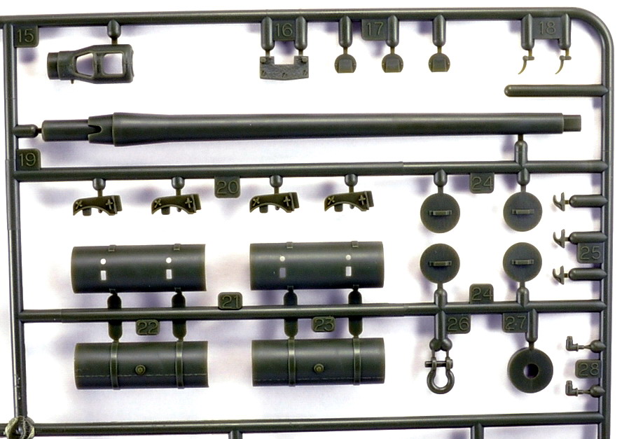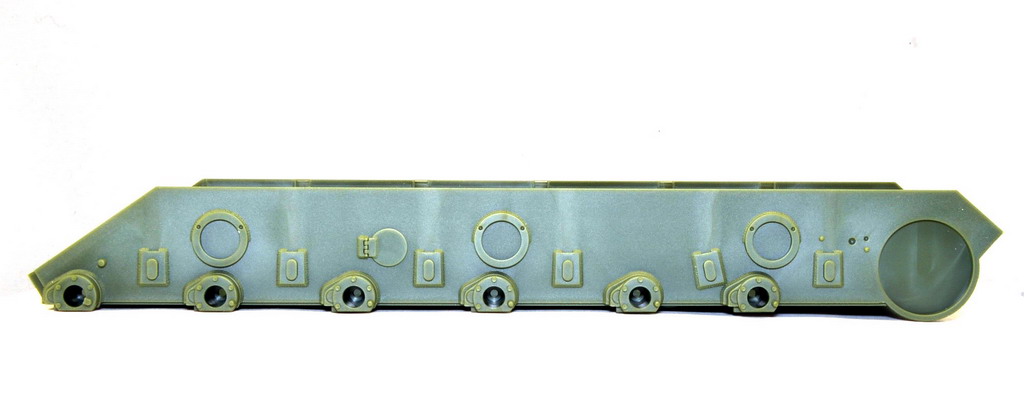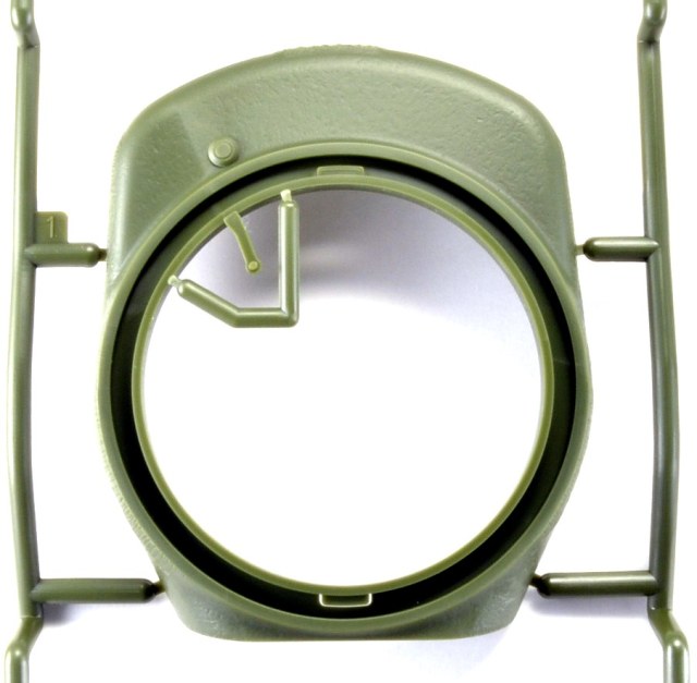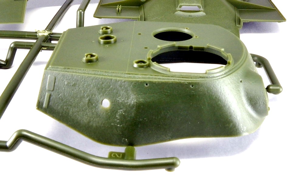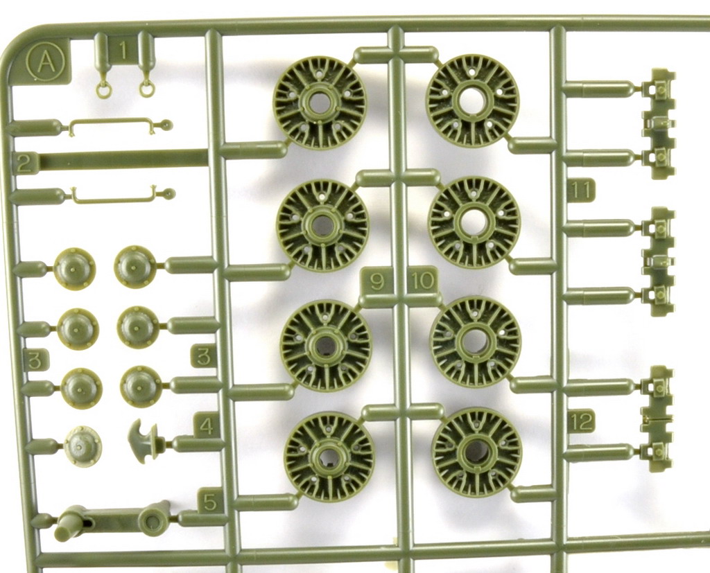 - Все детали модели умещаются на 4-х литниках из пластика зеленого цвета, из которых на одном крупные детали верха корпуса и башни, два с одинаковыми деталями ходовой и прочими дублирующимися элементами, и последний – со всеми оставшимися деталями, включая части тел двух танкменов. Тамия верна себе в склонности к упрощению. Ванна корпуса дана отдельной деталью. Качество отливок отменное, никаких расстройств в виде облоя, утяжин, недоливов и прочих чудес при беглом осмотре не обнаружено.