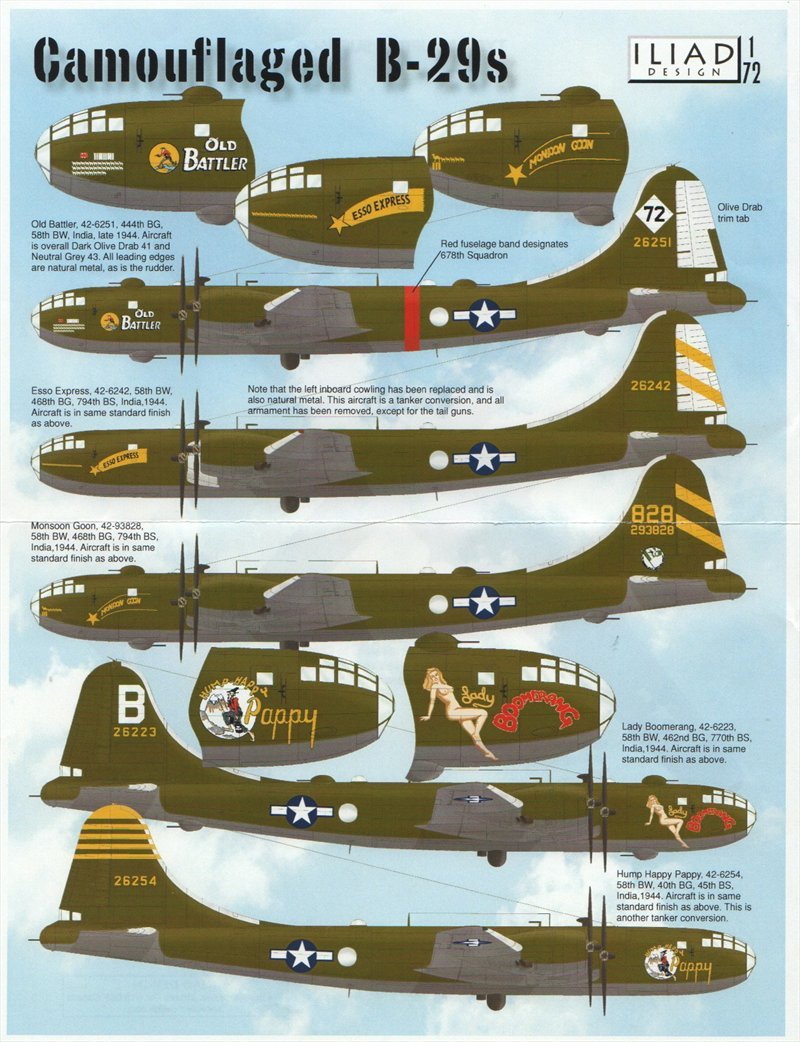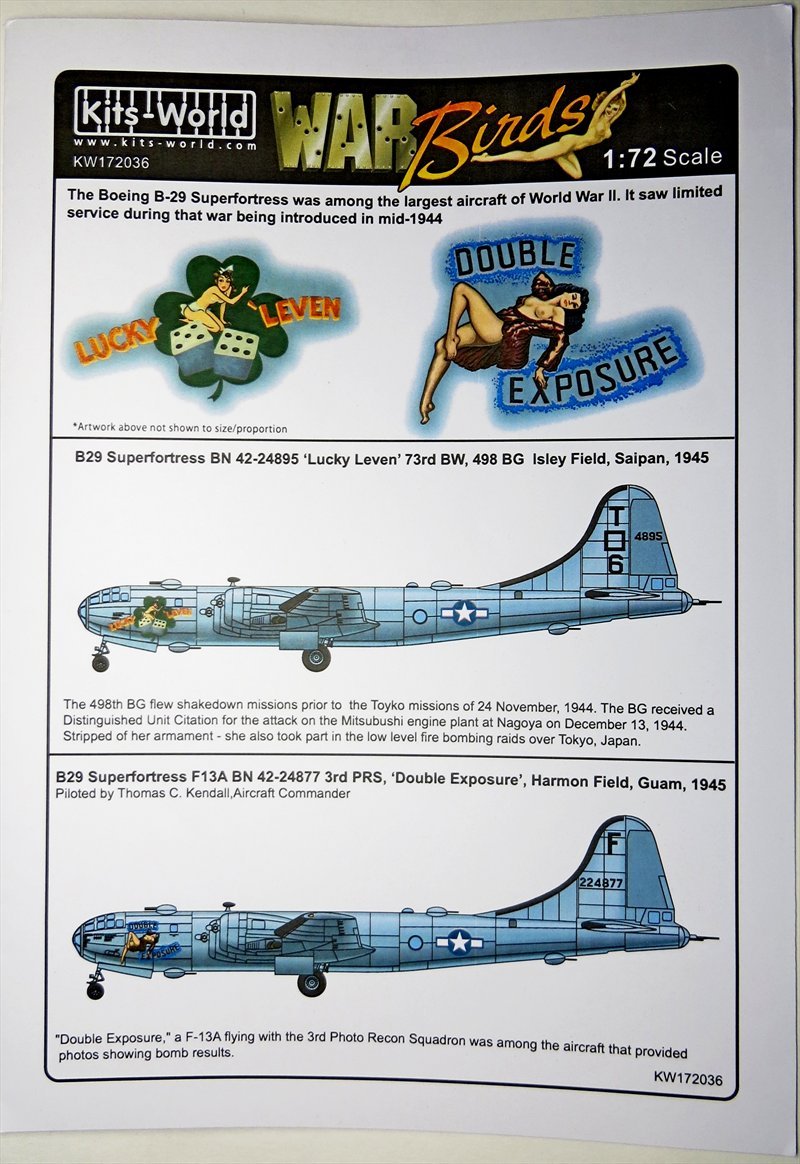 Также этот обзор, решил объединить с другим небольшим обзорчиком на смоляные колёса с имитацией нагрузки для B-29/B-50 от "TrueDetails" № TD72008. Колёса хорошо отлиты, жаль только надписей нет, в принципе всё видно на фото. Также имеется четыре варианта декалей: "HUMP-HAPPYPappy", "ESSO EXPRESS" и "OLDBATTLER", базировавшиеся в Индии, декали фирмы "ILIADDESIGN". А также декаль от производителя "Kits-World" № KW172036 "DOUBLEEXPOSURE на стратегический разведчик F-13A-55BW.