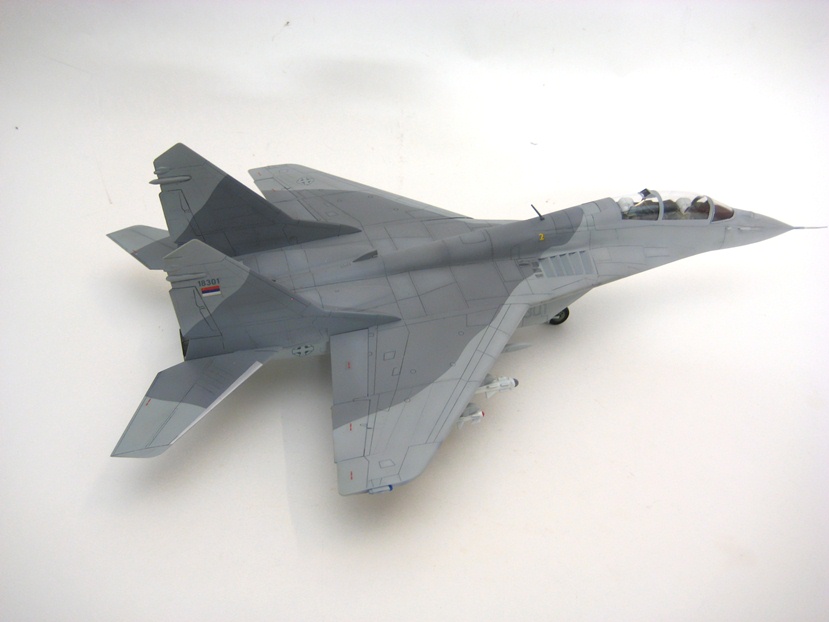 I painted model in new Serbian air force cammouflage with Mr color Gunship gray and RLM 76 with dark filter.