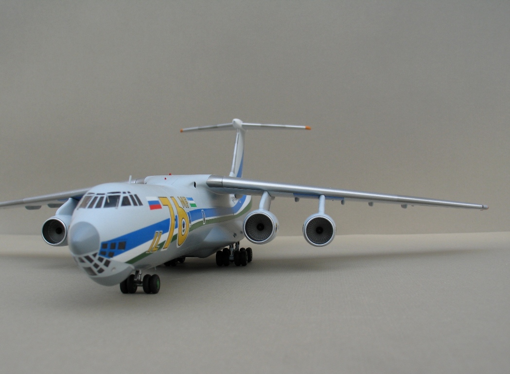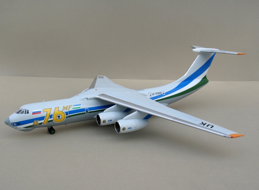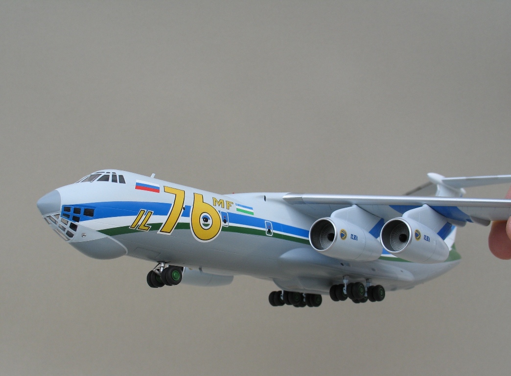 Всем здравствуйте!Впервые вживую Ил-76МФ я увидел на выставке МАКС 2003.Самолет понравился.Через год прикупил кит от Трумпетера и естественно,захотелось собрать именно ТАКОЙ Ил.О косяках производителях говорить не буду.Решил сделать изкаробку,изменив только то,что уж очень бросается в глаза.А это-колеса шасси(диски) и остекление кабины пилотов.Колеса дополнил фототравлением от Extratech,а форму переплета кабины пилотов(что дает производитель),я убрал.Тщательно заполировав остекление,нанес свои маски.Вставки в фюзеляж сделал из эпоксидки и стеклоткани,накрутив на трубу соответствующего диаметра.Хвостовую часть переделал на гражданский вариант,убрав турель.На этом первый этап изготовления модели закончился и Ил лег в долгий ящик лет так на 7.Сдерживающим фактором являлось отсутствие двигателей ПС-90.И вот,на просторах инета я узнаю,что в Хабаровске,один мастер изготавливает из смолы классные движки в 144 массштабе и именно ПС-90!!!!Заказал,приобрел,порадовался!!!Продолжил сборку...Как раз недавно в журнале Авиация и время опубликовали чертежи Ил-76МФ(помогло очень с пилонами).Из доработок по модели изготовил также внутренний пилон закрылка(китайцы про него забыли).Стойки шасси доработал фототравлением и изготовил двузвенники на основные опоры.Проблесковые маяки и белый БАНО от Elf.Шелковую декаль заказал у своего знакомого..За эти 10 с лишним лет,каким только регистрационным номером он не был!!!И UK 76900,и ИС 76900,и RA 76900 и просто 76900 без букв.Решил сделать таким,как его видел тогда.Кстати,тогда правый борт украшала надпись на русском ИЛ 76 МФ а левый на английском IL 76 MF.В данный момент надписи на английском слева и справа.Дополнительный номер 338(для авиашоу)наносить не стал.Покраска автомобильными нитро.Тонировка-рули,рампа.Грязнить не стал,ведь самодет как-никак для показушек!Ну вот пожалуй и все! Спасибо за внимание!!!
