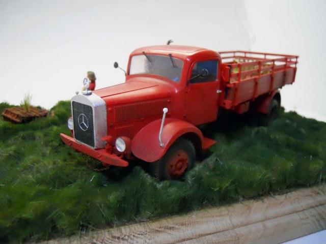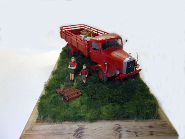 По отдельности все компоненты смотрелись бы хорошо, но вместе - адское сочетание... Говорят, что идеальной считается диорама, сюжет которой понятен и читается только при взгляде, без описаний и рассказов. Глядя на эту дио, у меня только куча вопросов возникает. Почему Мерс ярко-красный? Что он делает в траве вообще? Как коза и тележка попали в кузов и зачем? Кепку у пацана откуда? Одни вопросы... лучше назвать работу "Бавария глазами Сальвадора Дали", тогда вопросов не будет. Не обижайтесь, что увидел - то написал, имхо.