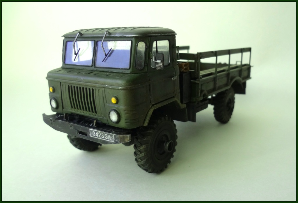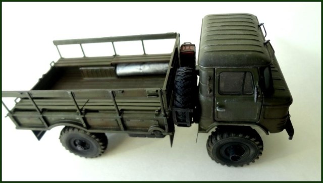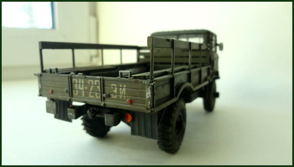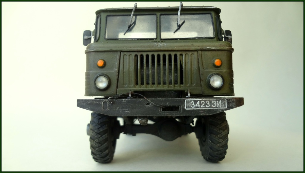 Построил из коробки немного доработал передний бампер: добавил полочки и отверстие для рукоятки. Доработал радиатор. Добавил тормозные шланги и проводку к задним фонарям. Оптику и путние колеса заказать возможности не было (сжатые сроки строительства), поэтому из коробки как есть. Немного доработал крепеж запаски, добавил и закрепил канистру. С нуля изготовил лобовое стекло, с уплотнителями и щетками дворников. Кинул в кузов свернутый лист металла.