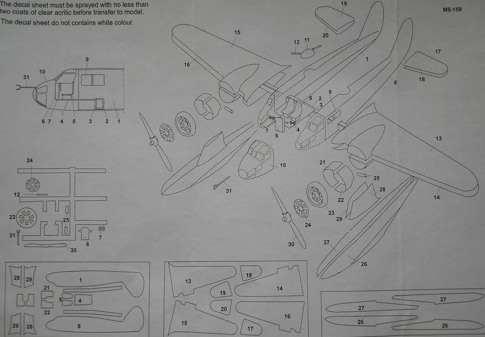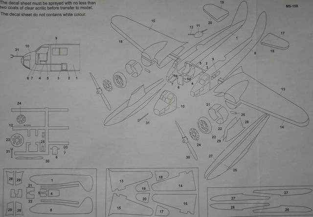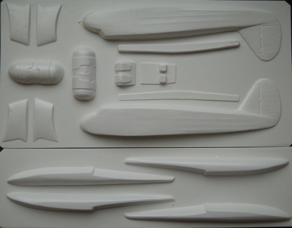 Вакуумформованная модель упакована в полиэтиленовый пакет. Масштаб 1/72, номер по каталогу 158. Фюзеляж, крыло, поплавки и другие крупные детали отформованы из листового пластика толщиной 0,8 мм. Мелкие детали - двумя шорт-ран литниками. Качество деталей на них посредственное, большинство подлежит замене, особенно двигатели и винты. Ваку-детали остекления неплохого качества. Фонарь пилотской кабины слегка помялся в моём наборе, но это поправимо.