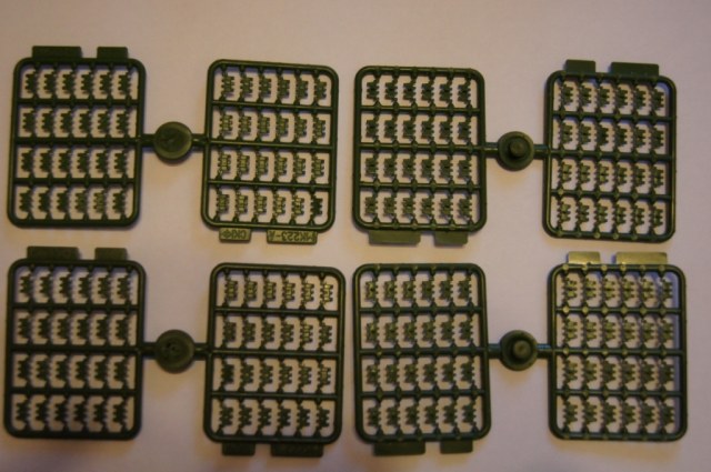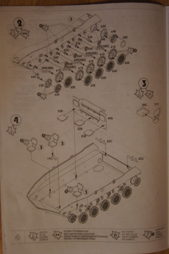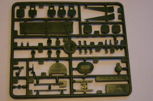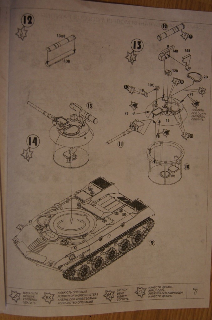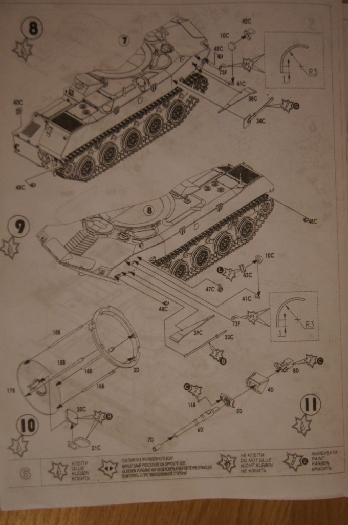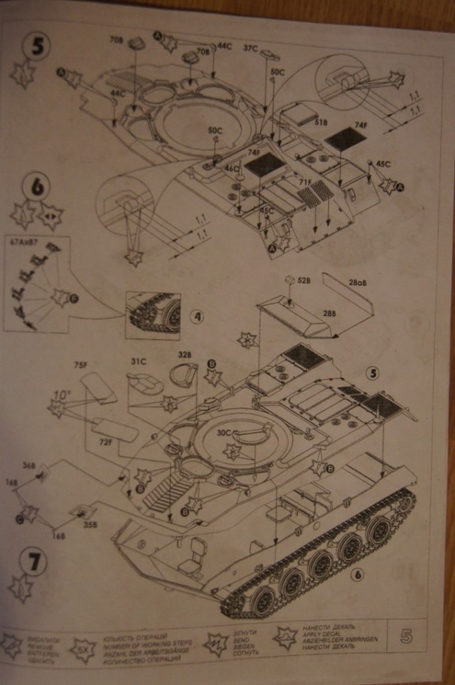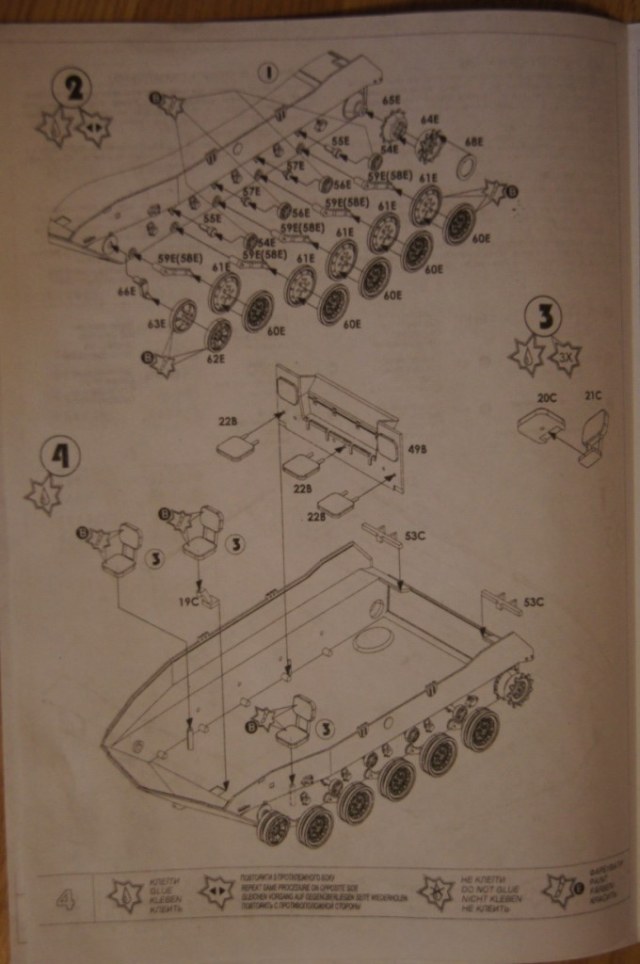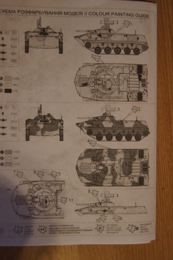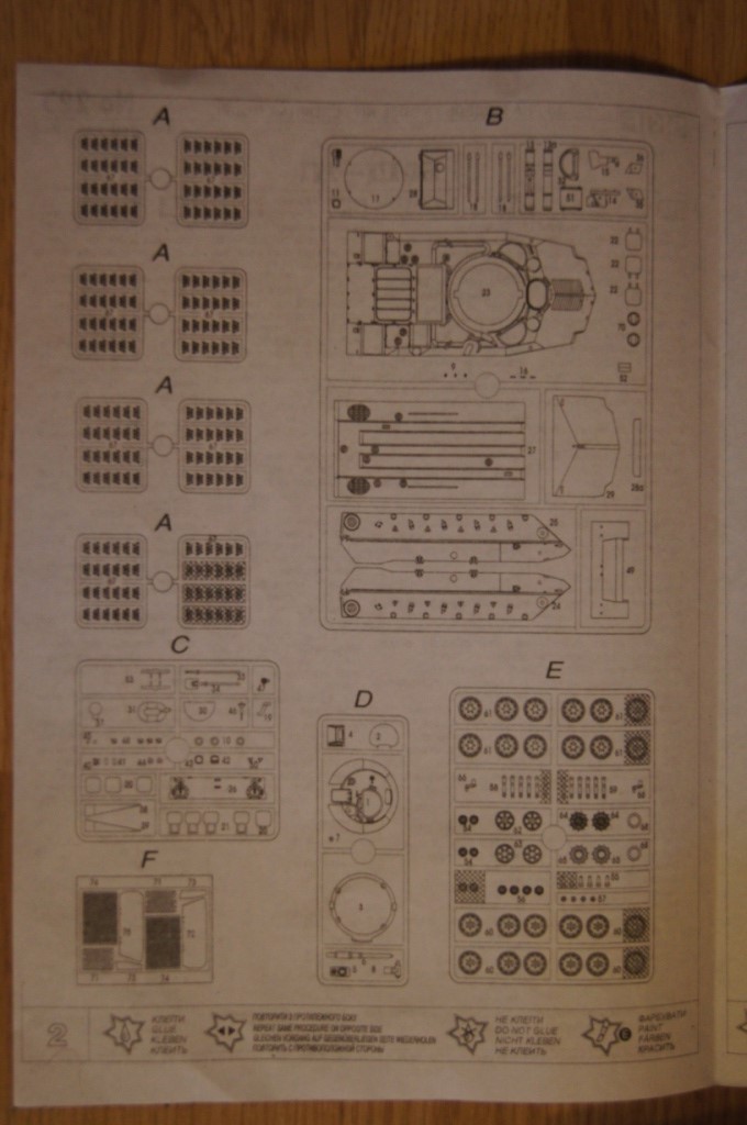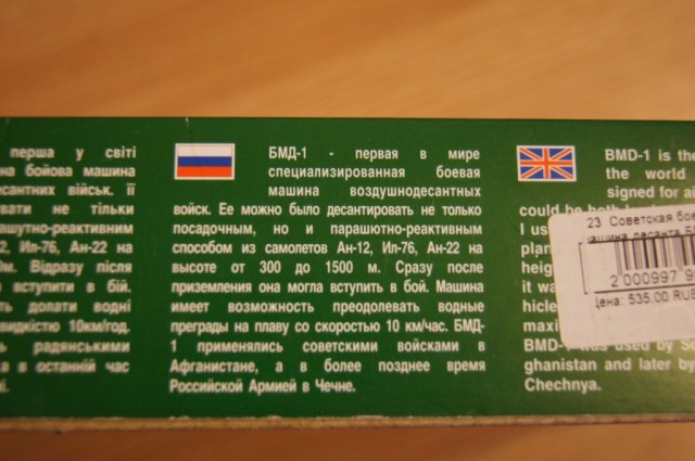На лицевой стороне коробки изображена сама Бмд-1, а так же её экипаж. В коробке мною было обнаружено 8 литников зелёного цвета, маленькая плата травления и декали. Подробнее по литникам: 4 литника с наборными гусеницами, 1 большой литник с верхней и нижней частью Бмд, остальные литники с башней, катками и всякой мелочью. Облой есть только на основном литнике, но там он легко счищается. Хочется отметить, что имеются основные части внутрянки: сиденья, "карусель", и отсек для пехоты. Всё отлито вполне хорошо - на 4. Фототравление весьма бедное: только волноотбойные щитки, и решётка над движком. Удивило то, что на коробке написано Бмд-1, в инструкции Бмд-1П, а на декали вообще Бмд-2! Но все-ж это Бмд-1П :)