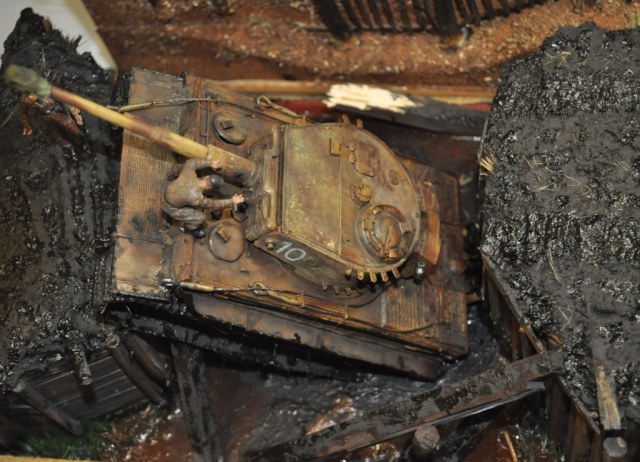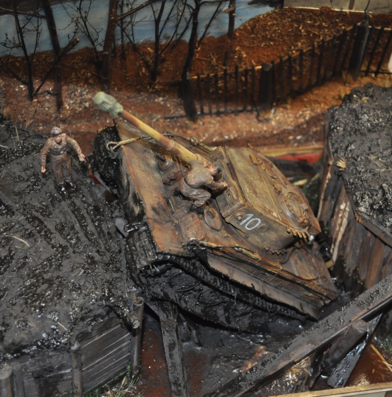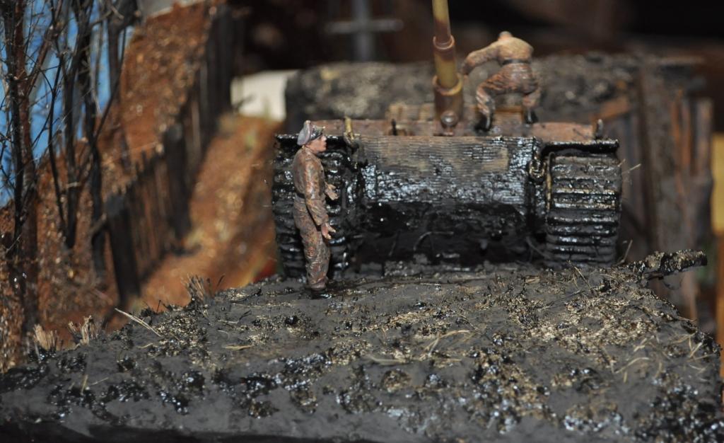 Задумка отличная,но грязь похоже действительно на смолу,тем более видимо по висячей керосинке,он не одну ночь там сидит в яме,грязь должна подсохнуть на гусеницах,тем боле он в весячем положение и обдувается хорошо).Вот все бы так фашисты тупили на своих танках,и дедам нашим меньше проблем на войне было бы)!