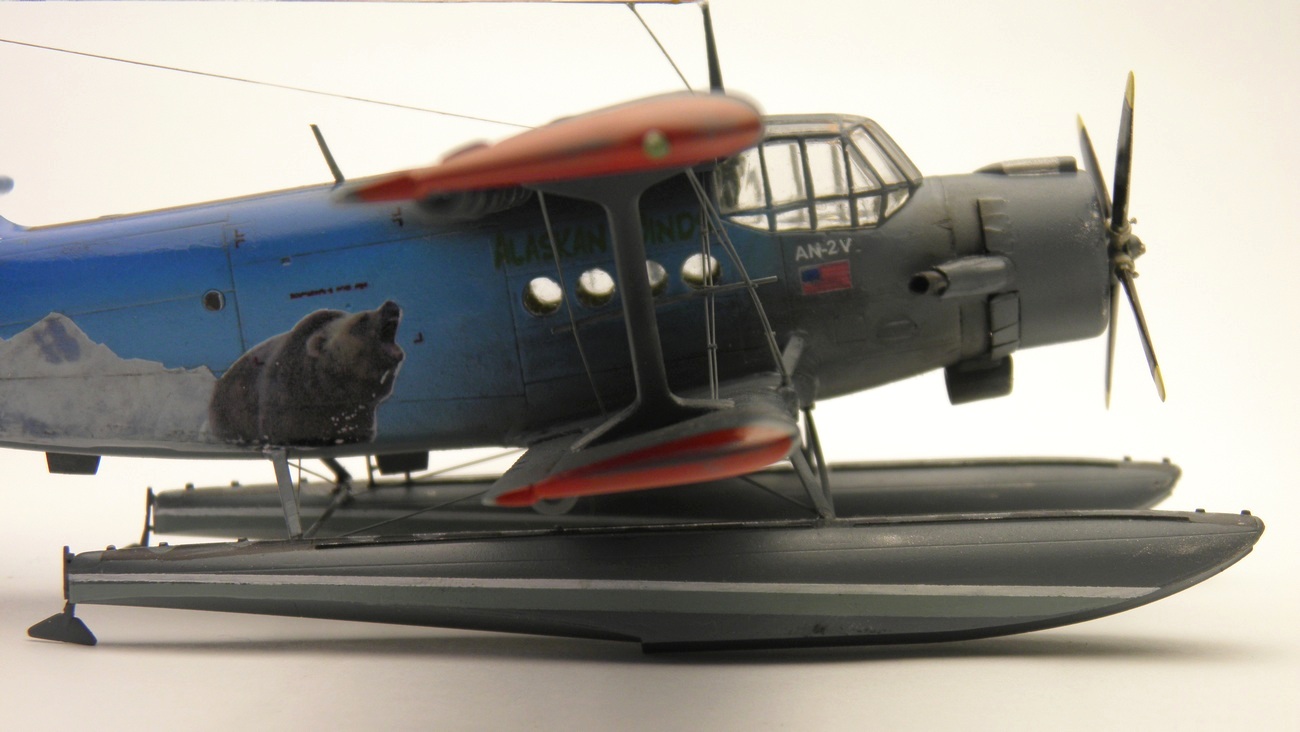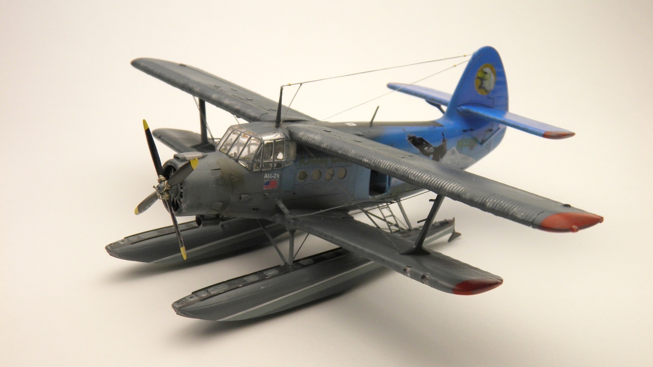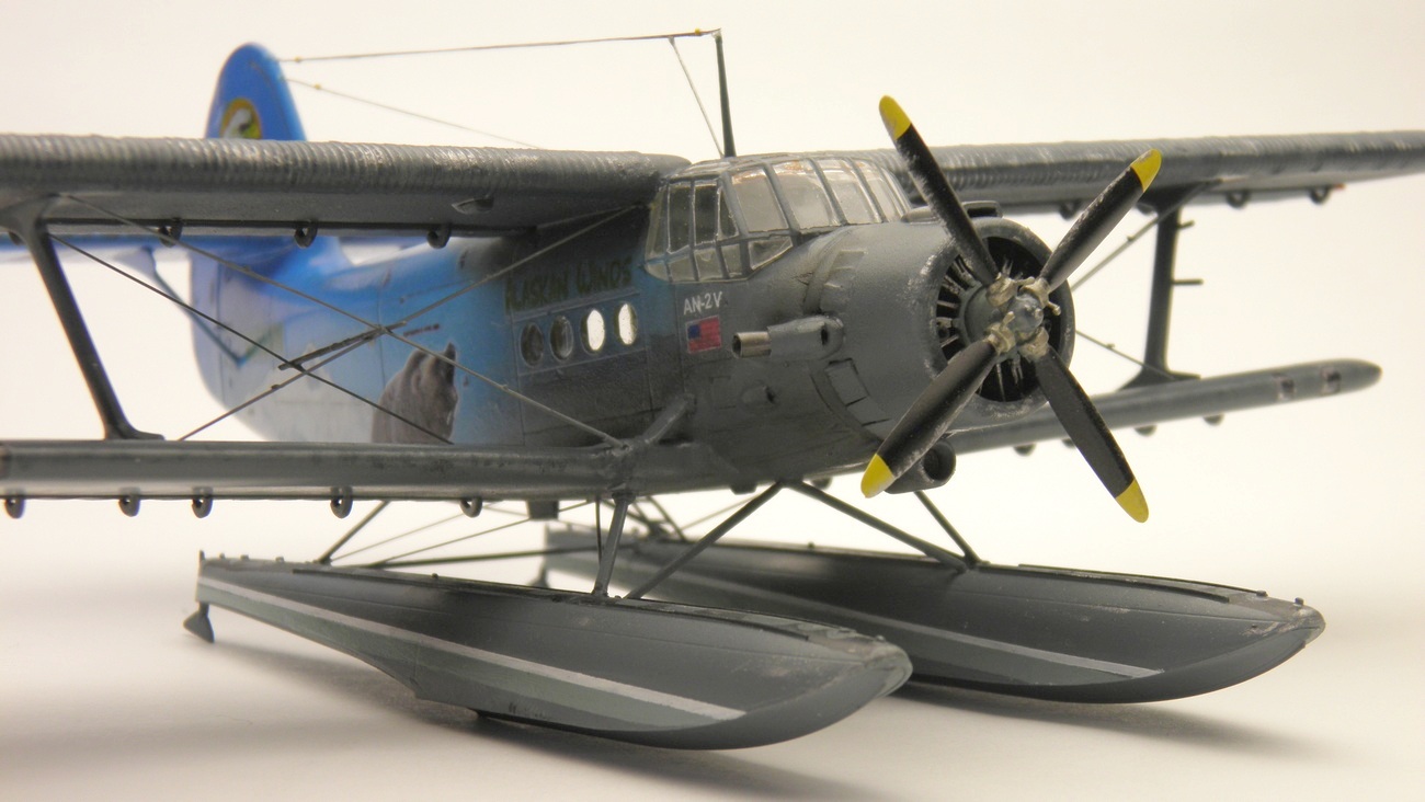 Вот и кончился перепил... Трамп "порадовал" возможностью помахать напильником в полной мере. Рассказать о том, что было переделано? Да почти все, кроме геометрии. Ее даже уже не промерял. Убран дикий провис на плоскостях, переделана кабина пилотов (добавлена приборка, рычаги, боковые стенки, воздуховоды, солцезащитные козырьки и шторки сверху кабины), детализирован салон (добавлены пол, потолок, силовой набор, сиденья), детализирован двигатель, переделан винт, переделан капот, воздухозаборники, масляный радиатор, выхлопной тракт с нуля, переделаны все антенны сверху, перерезана расшивка на плоскостях, добавлены передние кромки из фольги, переделаны фары, выброшены в мусор и заново изготовлены иллюминаторы, лестница. Сразу же была лихая мысль изготовить несуществующий борт именно в этой ливрее (уж очень понравилась). Увидел тут: http://www.avsimrus.com/digest/topic/122915-%D0%B0%D0%BD%D1%82%D0%BE%D0%BD%D0%BE%D0%B2-%D0%B0%D0%BD-2/top/50/ Поэтому пришлось учиться делать себе декали. Расчалки-тянутый литник. Красилось акрилом от тамии, лак от них же, смывки и пигменты от МИГ и Вилдер, также использовались масляные точки и косметические карандаши. Стройка была долгой, но интересной.