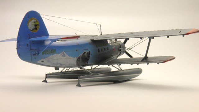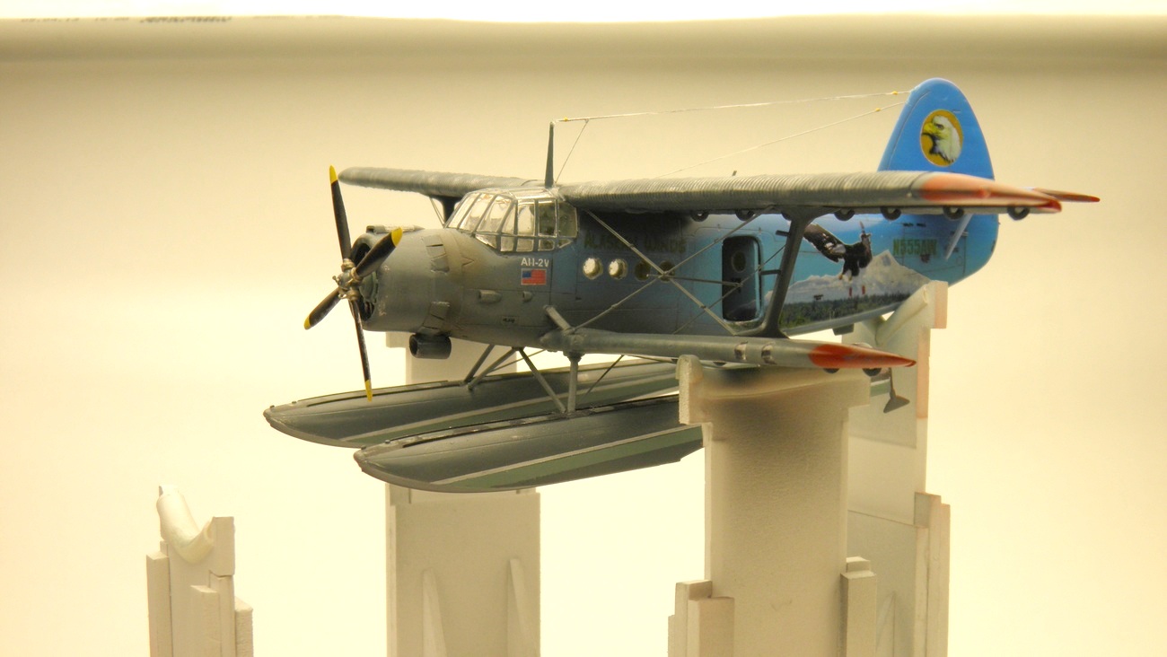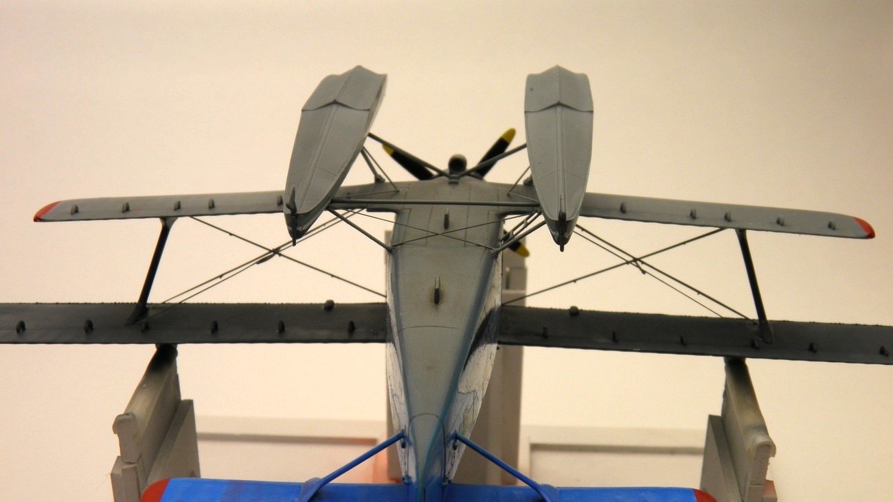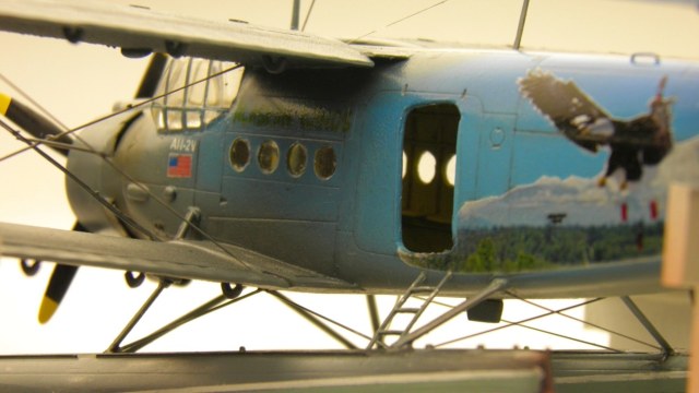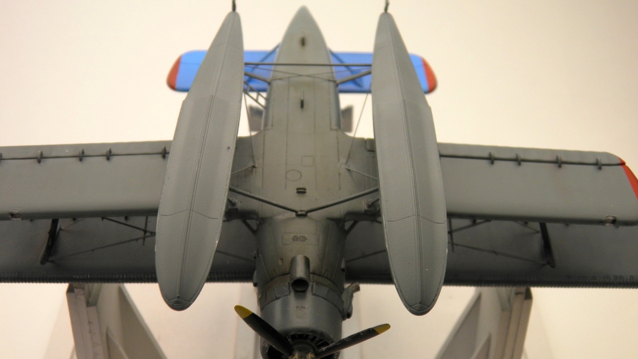 Вот и кончился перепил... Трамп "порадовал" возможностью помахать напильником в полной мере. Рассказать о том, что было переделано? Да почти все, кроме геометрии. Ее даже уже не промерял. Убран дикий провис на плоскостях, переделана кабина пилотов (добавлена приборка, рычаги, боковые стенки, воздуховоды, солцезащитные козырьки и шторки сверху кабины), детализирован салон (добавлены пол, потолок, силовой набор, сиденья), детализирован двигатель, переделан винт, переделан капот, воздухозаборники, масляный радиатор, выхлопной тракт с нуля, переделаны все антенны сверху, перерезана расшивка на плоскостях, добавлены передние кромки из фольги, переделаны фары, выброшены в мусор и заново изготовлены иллюминаторы, лестница. Сразу же была лихая мысль изготовить несуществующий борт именно в этой ливрее (уж очень понравилась). Увидел тут: http://www.avsimrus.com/digest/topic/122915-%D0%B0%D0%BD%D1%82%D0%BE%D0%BD%D0%BE%D0%B2-%D0%B0%D0%BD-2/top/50/ Поэтому пришлось учиться делать себе декали. Расчалки-тянутый литник. Красилось акрилом от тамии, лак от них же, смывки и пигменты от МИГ и Вилдер, также использовались масляные точки и косметические карандаши. Стройка была долгой, но интересной.