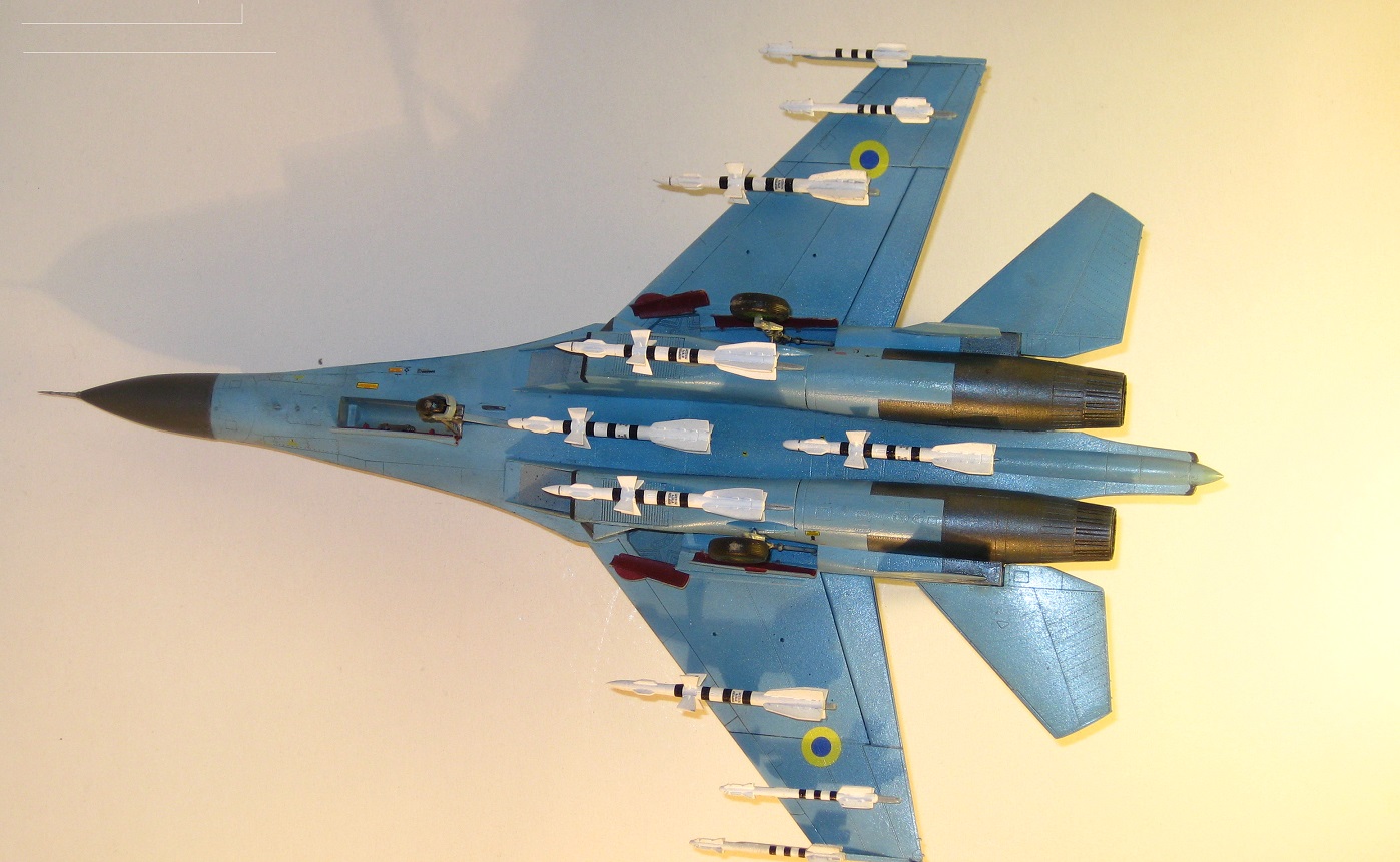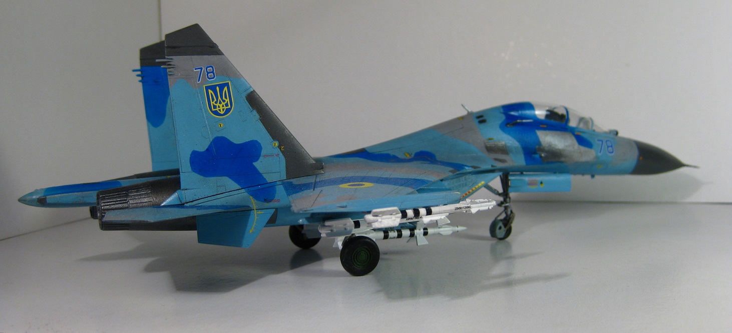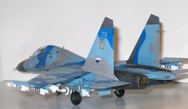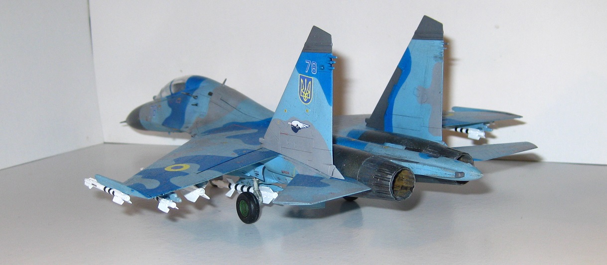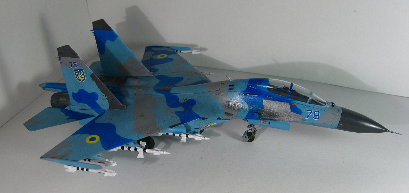 Это всем известный СУ-27 УБ от Трумпетера. Собирал полностью из коробки, ничего не переделывая. Краски использовались: "хобби колор" , "тамия", "хамброл", "хо-ма". Грунт какой-то самый обычный строительный в аэрозоли, польский. Из афтермаркета только декали ОЗ ВВС Украины от "Дан Моделс". Смывка из художественной краски цвета "сажа газовая" + уайт спирит.