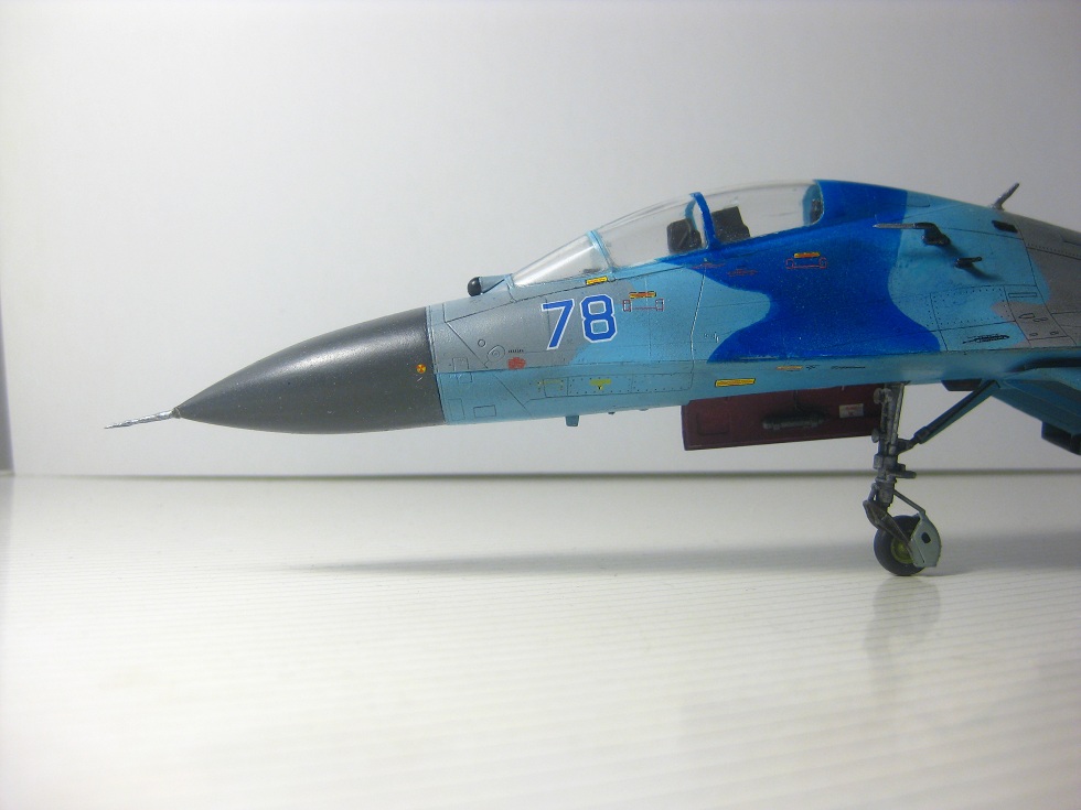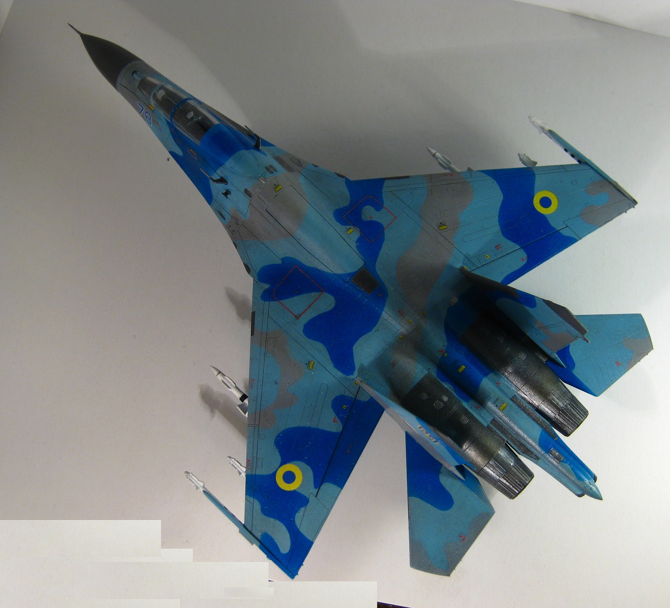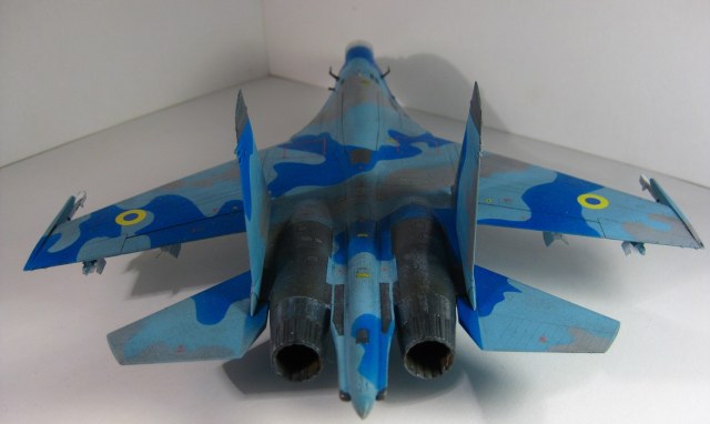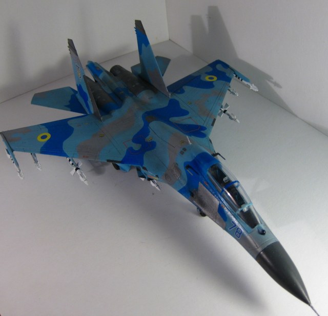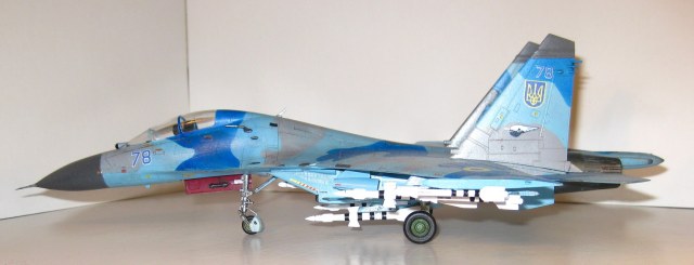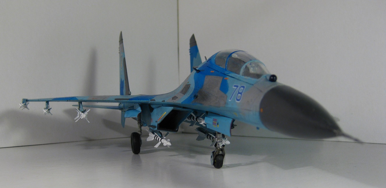 Это всем известный СУ-27 УБ от Трумпетера. Собирал полностью из коробки, ничего не переделывая. Краски использовались: "хобби колор" , "тамия", "хамброл", "хо-ма". Грунт какой-то самый обычный строительный в аэрозоли, польский. Из афтермаркета только декали ОЗ ВВС Украины от "Дан Моделс". Смывка из художественной краски цвета "сажа газовая" + уайт спирит.