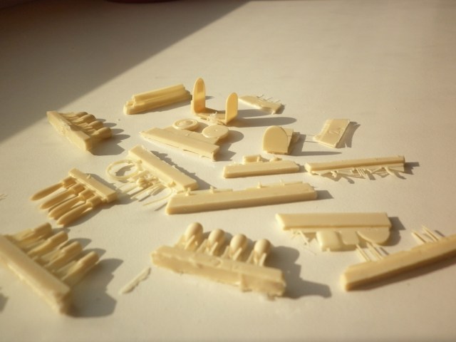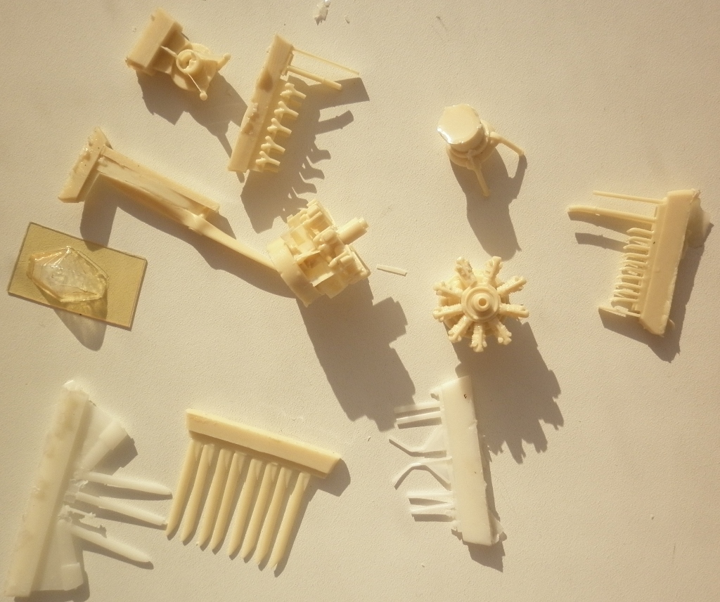 Детали из стандартной желтоватой смолы расфасованы по отдельным запаянным карманам отдельного пакета. Качество отливок - одно из лучших в "смоляном мире". Некоторые мелкие детали страшно даже отделять от основания -слишком уж они миниатюрны. Афтемаркет этой модели противопоказан. Есть и полезные "излишества" - один двигатель и часть бомб могут пригодится при изготовлении того же Уоллеса.