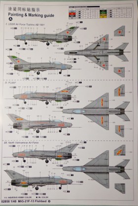 Легендарный МиГ-21 Ф13 в 48-м масштабе от Trumpeter. Качество набора на довольно высоком уровне, облоя и утяжин не обнаружилось, деталироввка то же на довольно высоком уровне. В наборе идет не большая плата травления, резиновые колеса (только задние) и довольно большой выбор вооружения (блоки НАР, бомбы 250 кг, ракеты рс-2и3). Декали дают выбор из 6-ти самолетов из которых советский только один. Есть и чешский, но на схеме есть ошибка, там он изображен с "советским" фонарем - будте внимательны ! Если вас не устроили варианты представленные производителем, то есть возможность приобрести декали от "Бегемота", как с техническими надписями, так и с опознавательными знаками. Не порадовало качество пластика, точнее его матово-шагристая поверхность, придется шлифовать.
