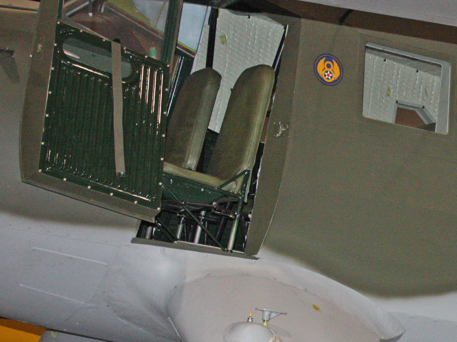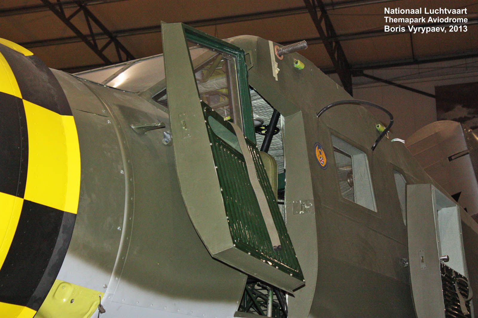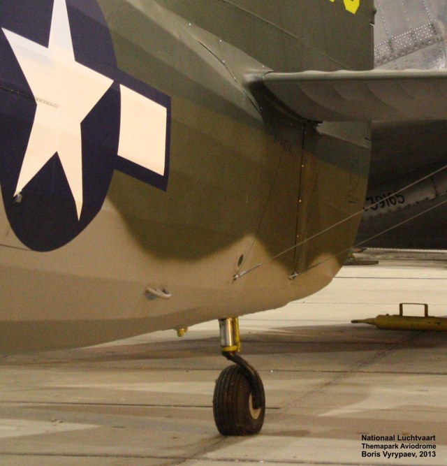 Экспонат находится в полутёмном ангаре, снимки делал как со вспышкой, так и без; фотографии, соответственно, размещены попарно. Сам ангар не очень предназначен для экcкурсантов, перемещаться в нём можно толко по узенькой дорожке шириной полтора метра у стены, да ещё разрешено подняться на такую же дорожку на втором ярусе. Всякие мои поползновения перелезть через ограду, чтобы сфотографировать самолёт поближе, тут же пресекались.