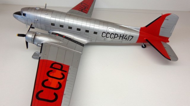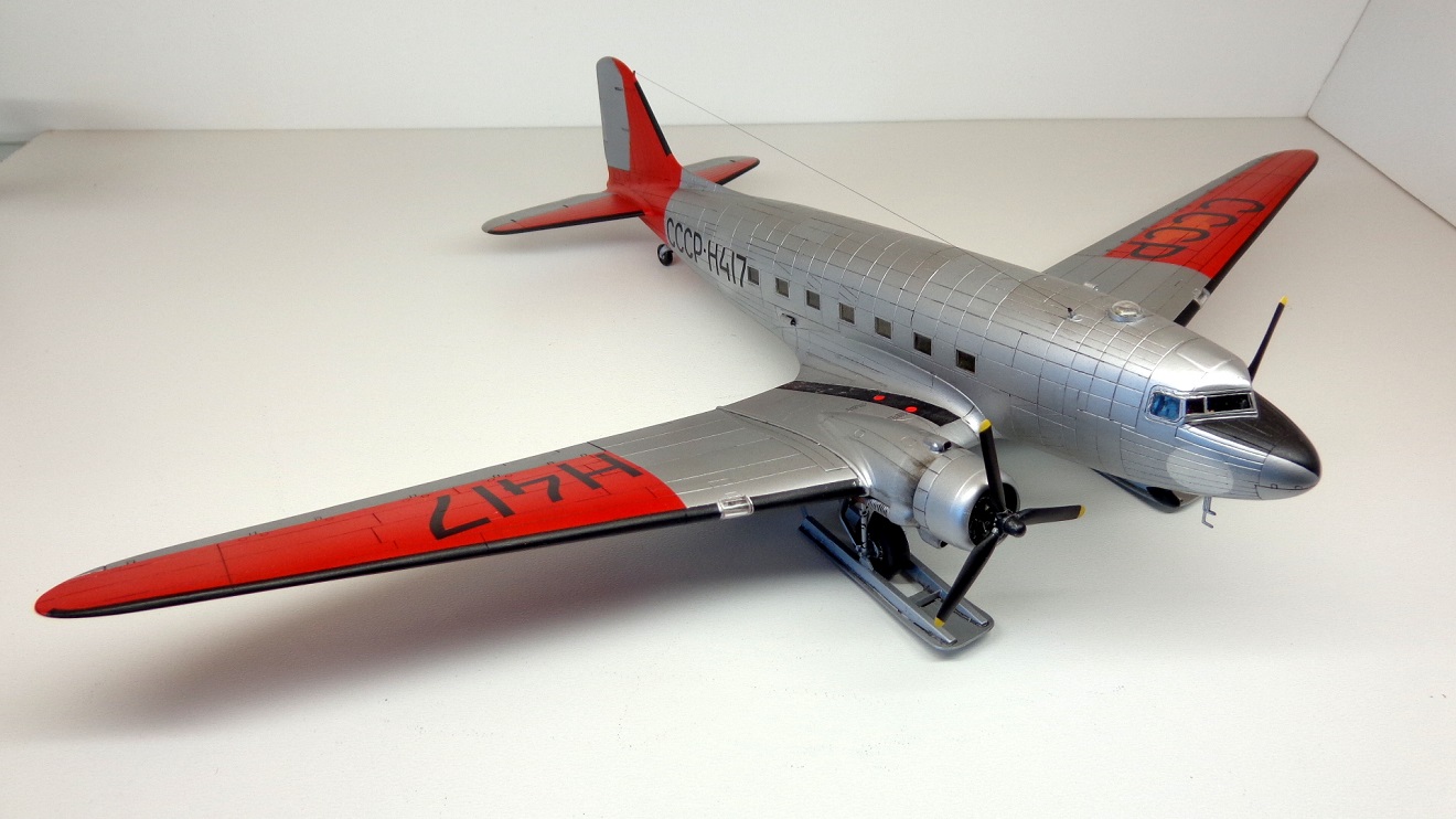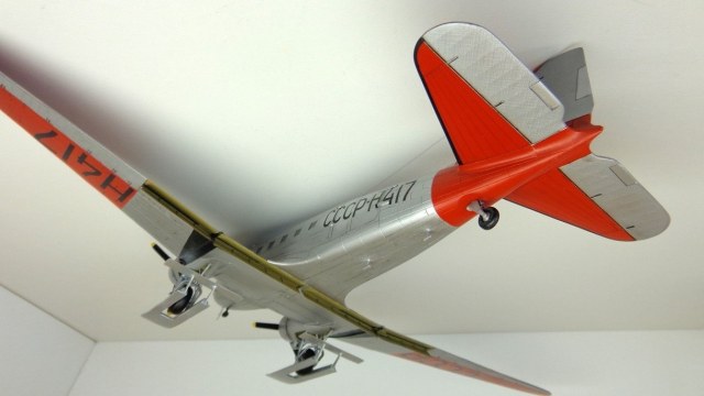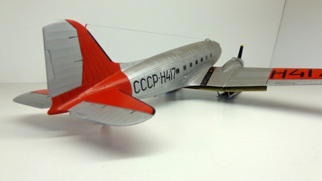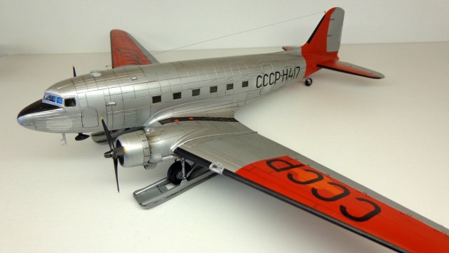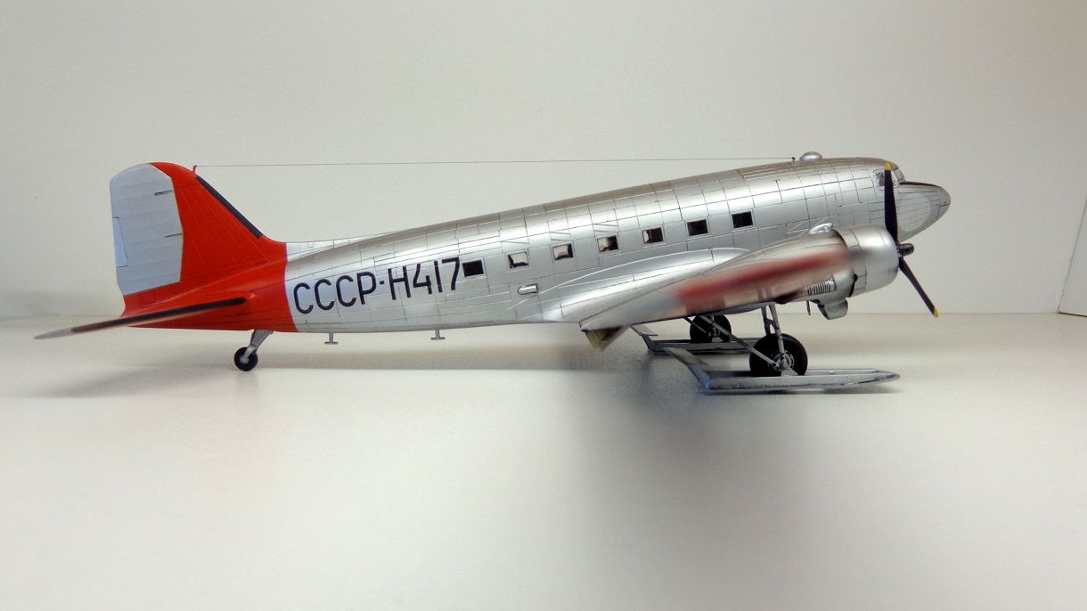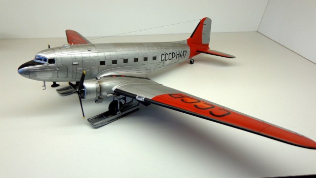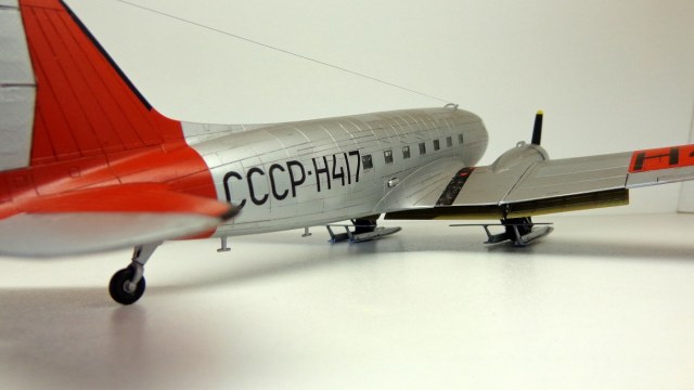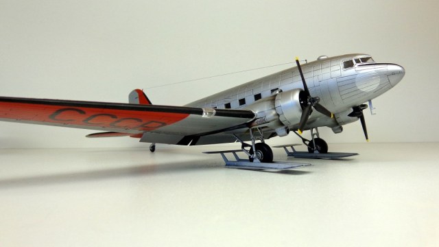 По модели - обычная для меня "изкаропка". Только, ещё увидев на фото прототипа некоторые антенки, воздухозаборники (по видимому имеющиеся только на R4D-5) тоже их добавил. Ну и конечно, самая приметная деталь - оригинальные лыжи, которые пришлось изготовить самостоятельно. Окрашено Тамией, эмалями. Вообще модель (ех-ЕSCI) легка в сборке, не доставила проблем. Хочу посоветовать её и тем, кто хочет собрать не только С-47, сам я планирую сделать ещё и ПС-84.