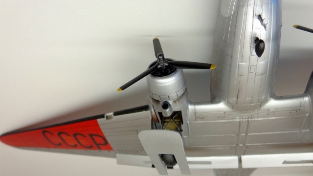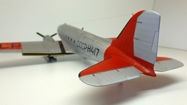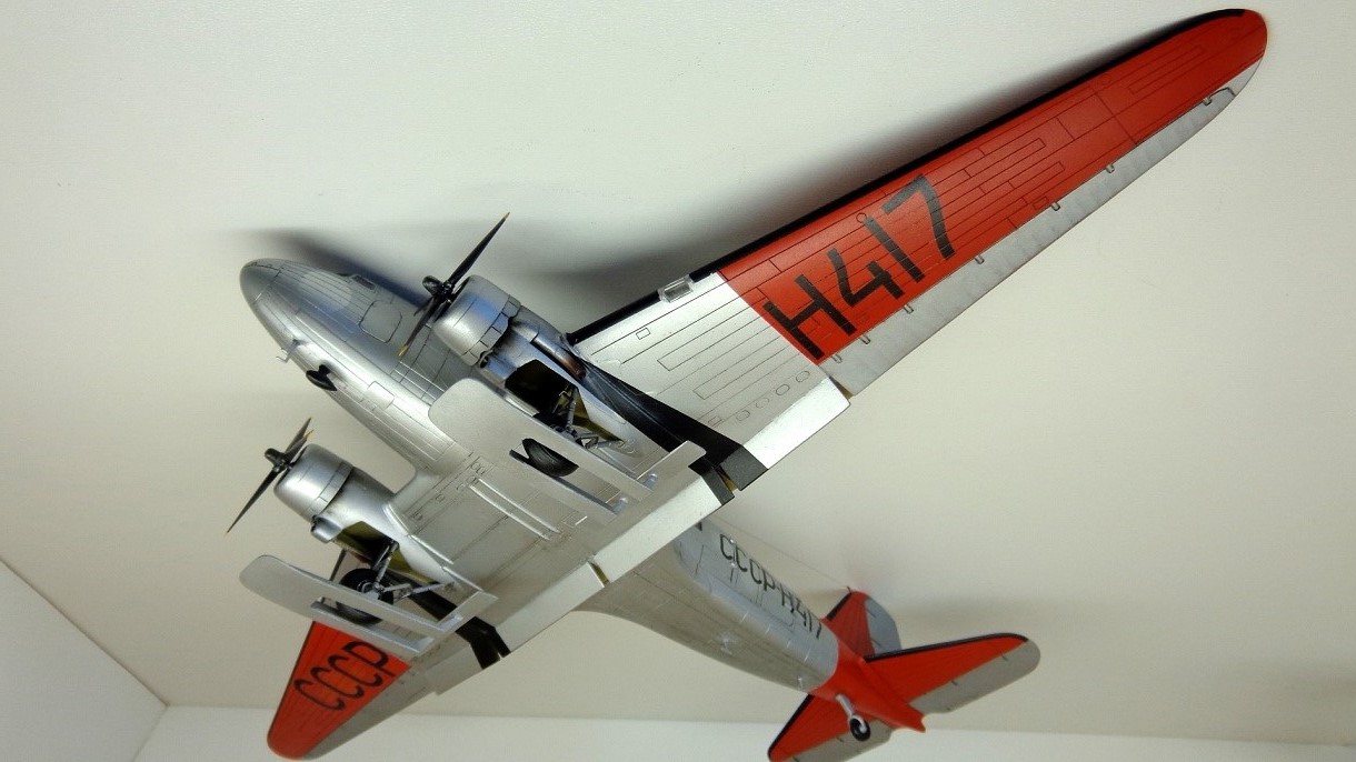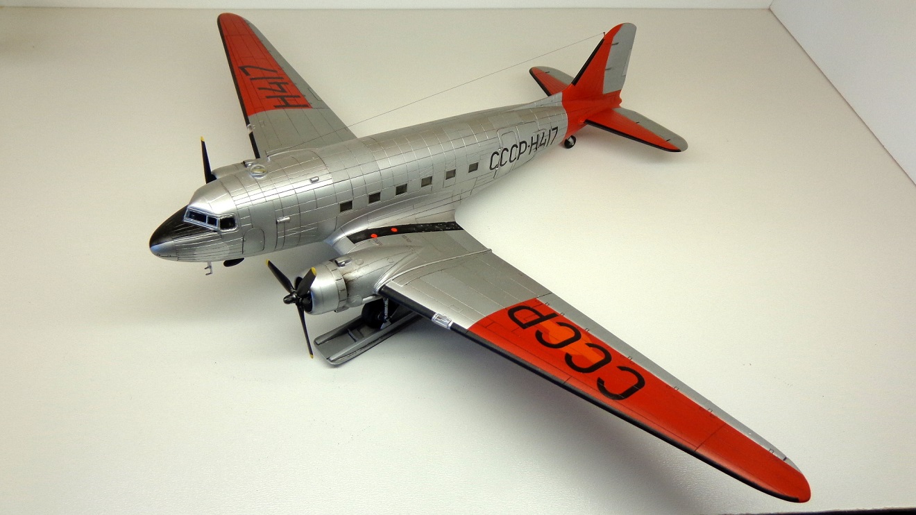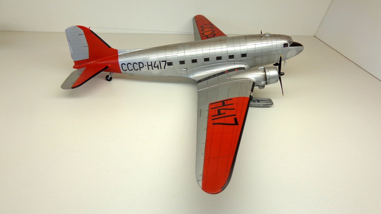 По модели - обычная для меня "изкаропка". Только, ещё увидев на фото прототипа некоторые антенки, воздухозаборники (по видимому имеющиеся только на R4D-5) тоже их добавил. Ну и конечно, самая приметная деталь - оригинальные лыжи, которые пришлось изготовить самостоятельно. Окрашено Тамией, эмалями. Вообще модель (ех-ЕSCI) легка в сборке, не доставила проблем. Хочу посоветовать её и тем, кто хочет собрать не только С-47, сам я планирую сделать ещё и ПС-84.
