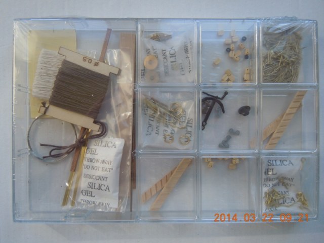 - пластиковая коробка с блоками, дельными вещами, и прочей деталировкой. Качество весьма неплохое. Все размещено в разных ячейках. Однако по опыту "Марички-Иванны" сразу отмечаю, что блоков не хватит на полноценный такелаж. Отсутствуют кофель-нагели (на прототипе их масса)...