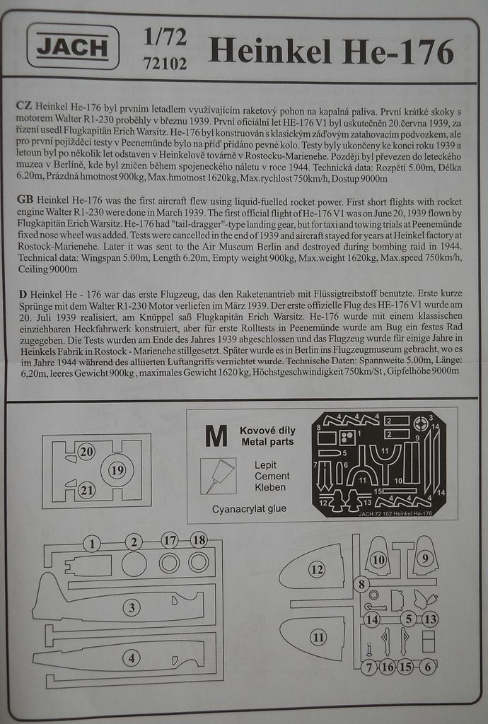 Набор содержит два литника с пластиковыми деталями, один прозрачный литник с элементами остекления фонаря кабины пилота, плату с фототравлением и лист инструкции.