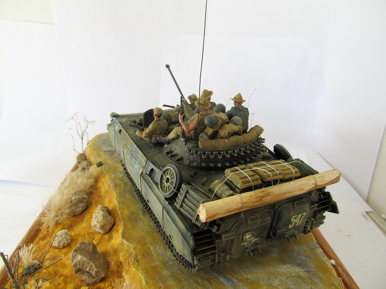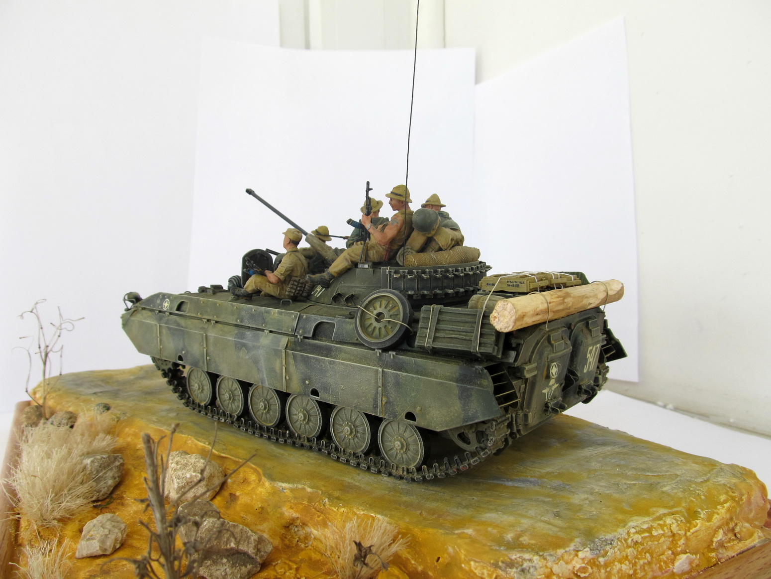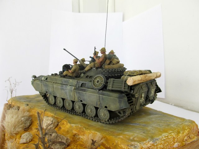 Если не против и я прокоментирую вашу работу. Равномерно нанесесение пигменты не есть Хорошо. Пыль оседает где то больше а где то меньше. Цвета камуфляжа я так и не понял какого цвета. Все съела пыль. Очень сильно не хватает ощущение металла. Ребра на носу протерты до какой то светлой краски но не До металла. Странно? Вообще не хватает сколов.Без них машин принимающих в б.д. Я не представляю. Запасные траки тоже выглядят Не живо. Можно было поработать с пигментами.Гарь От выхлопа на треть борта это тоже перебор. Ну и бревно. Оно Как будто срублено час назад но Это конечно возможно .