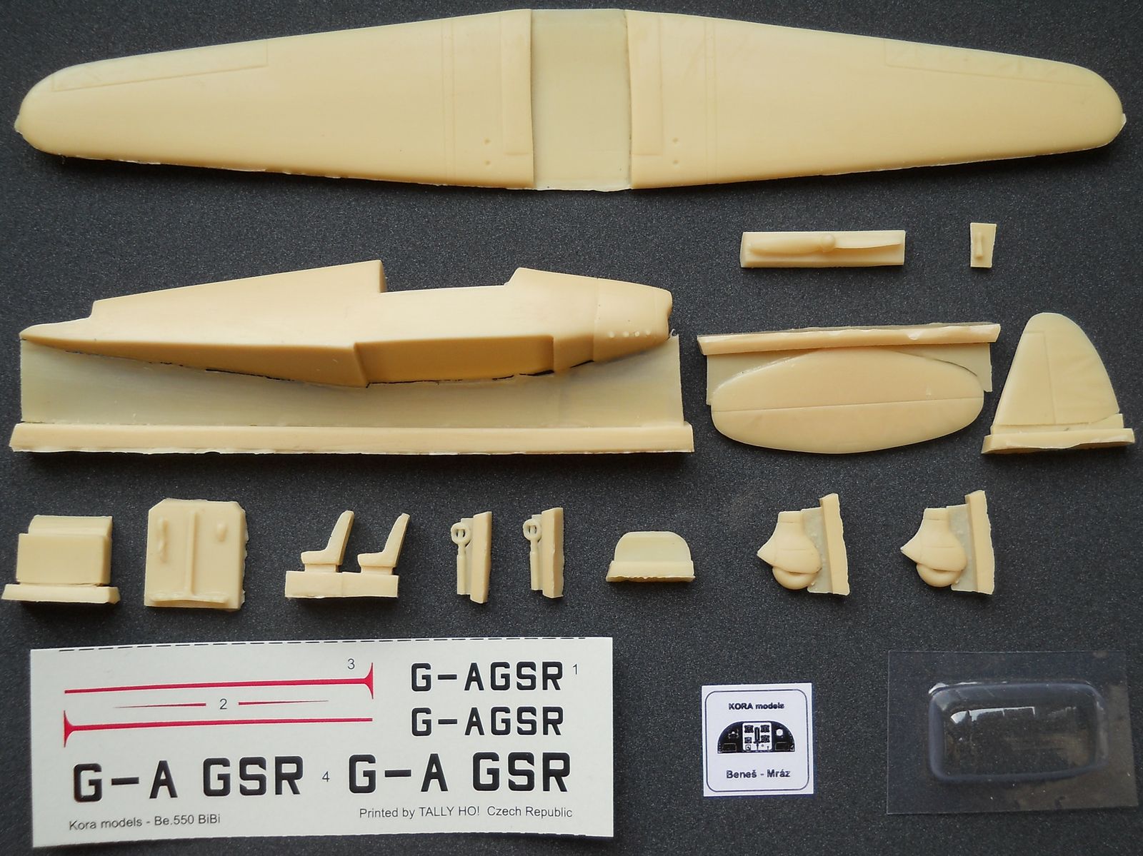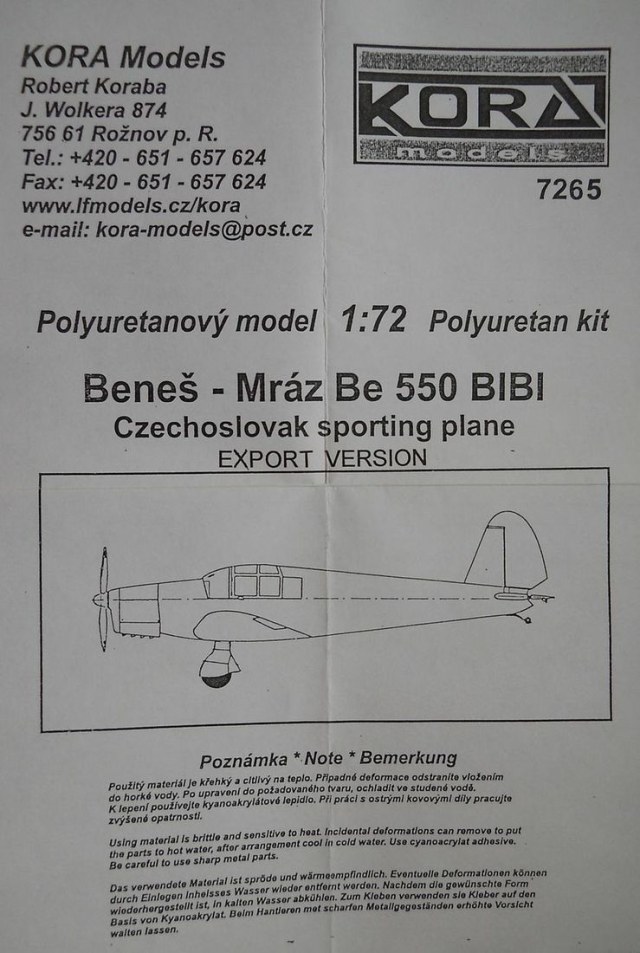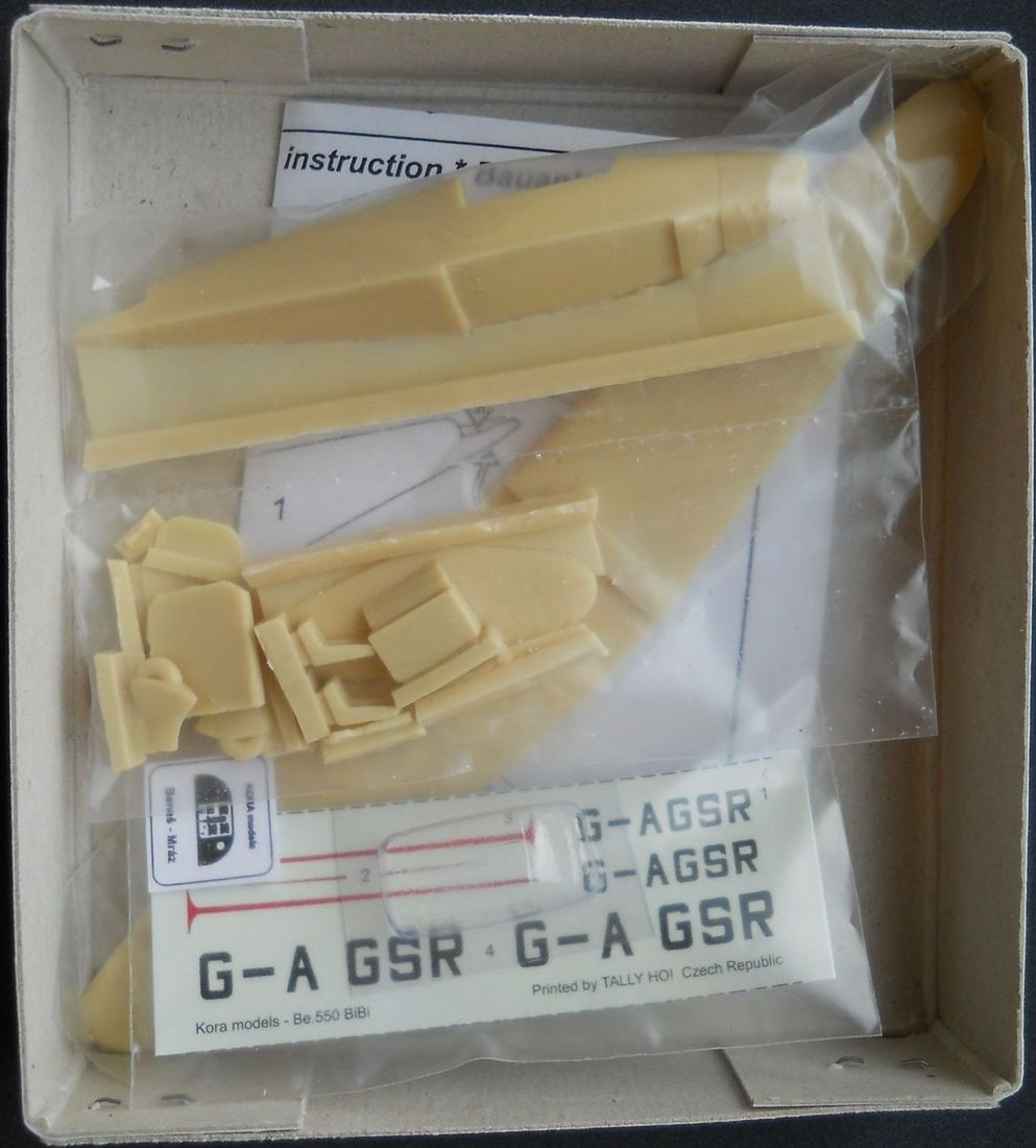 Модель от фирмы KoraModelsв масштабе 1/72 из смолы (номер по каталогу 7265). Коробка из тонкого картона имеет типичный для этой фирмы маленький размер (для небольших моделей) 12х11х3см. Внутри в пакетиках размещаются смоляные детали, фонарь, декали и инструкция. Литьё довольно неплохого качества, дефектов и пузырей нет. Фюзеляж и крыло отлиты целыми деталями. Кабина даётся углублением в фюзеляже. Интерьер в виде нескольких деталей. Приборная доска прилагается не в виде декали, как может показаться, а отпечатана на бумаге. Обтекатели шасси выполнены заодно с колёсами. Выхлопные патрубки снизу капота слишком упрощены. Ваку-фонарь приемлемого качества. Декаль на один вариант – тот самый самолёт, что использовался в RAF. Инструкция по сборке и окраске достаточна информативна.