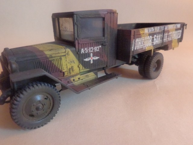В целом неплохая работа. Не понравилось остекление, наверно лаком задули. У декалей видно подложку, ну и между досок их надо прорезать. Судя по всему грузовик уже какое то время эксплуатируется? Тогда глушитель будет ржавым, тут такое чувство, что в камке. Про матчасть не буду. Ну и фото абсолютно не галерейные.