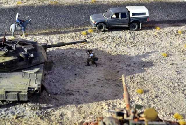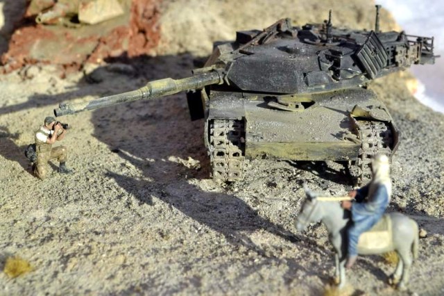 Мне кажется нет общего фото и "зарывшегося" танка, а так же не помешало бы дерево меж машиной и репортёром, или рядом с машиной. А вообще отсутствует целостность и логичность: целостность из-за пустого места(какие-то отдельные сюжеты, не раскрывающие сущность работы), от сюда и логика - что, зачем, почему, диорама должна отвечать на эти вопросы. А так - видно одна из первых.