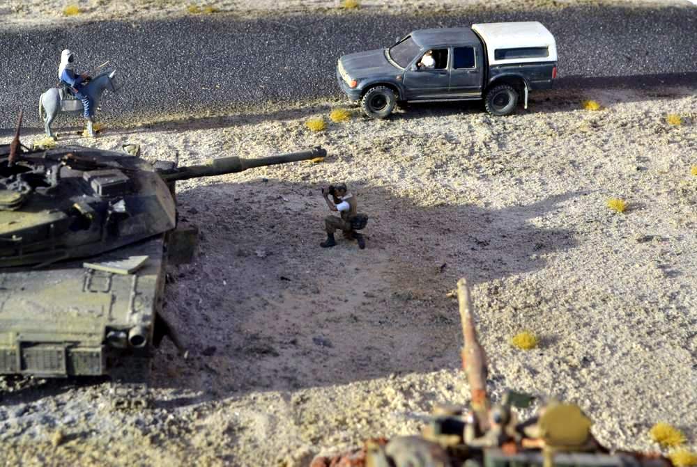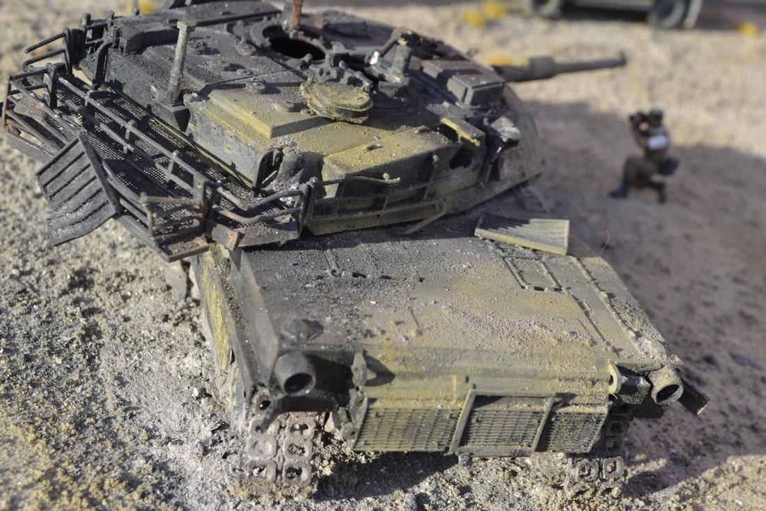 Полностью поддерживаю, как-то пусто на диораме, глазу не за что зацепиться, так много места, и почти всё оно пустое, катастрофически не хватает мелочей, каких-то деталей, мусора, мелких обломков и т.д. Фигурки грубовато расписаны. Танк, тоже не ахти как исполнен, какие-то желтые пятна, откуда они взялись на нем, не совсем понятно, в камуфляжной схеме американских танков, нет такого цвета. Понравились траки с выгоревшими резиновыми накладками, смотрится здорово.