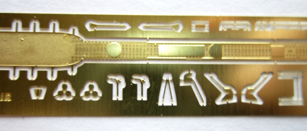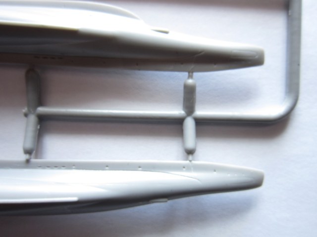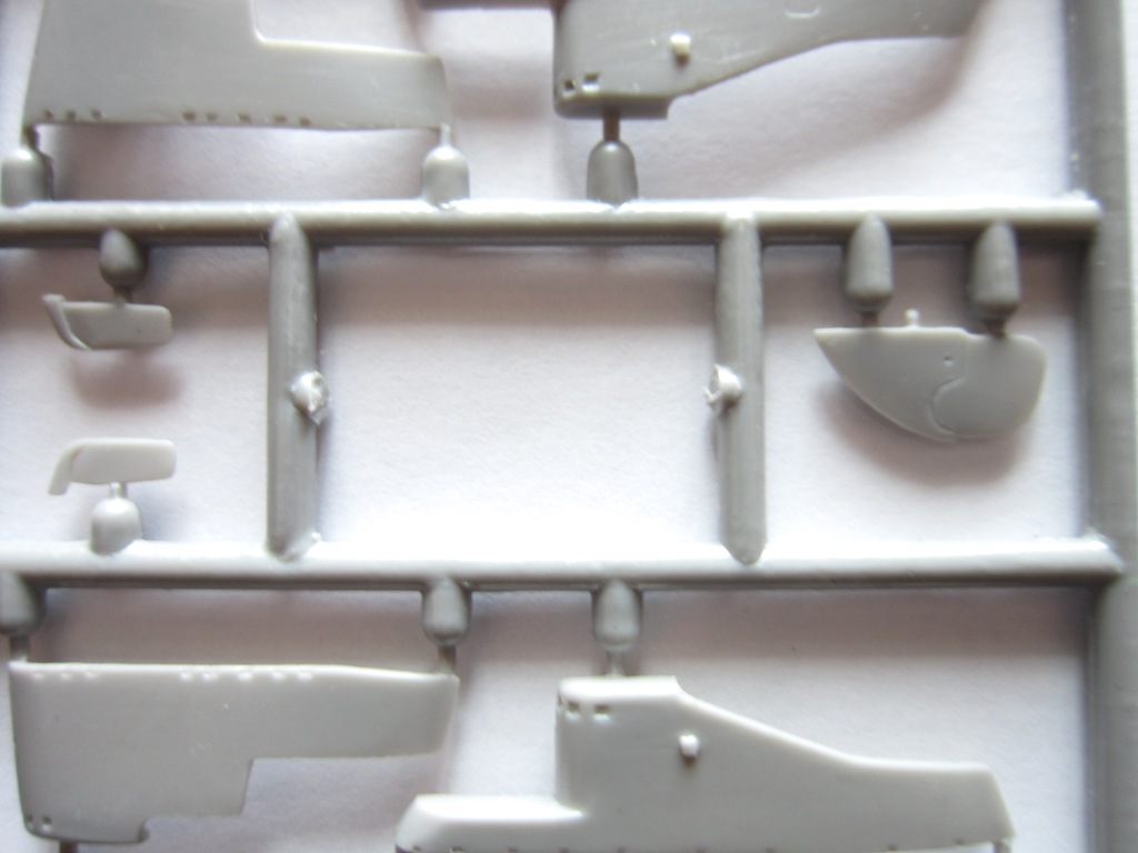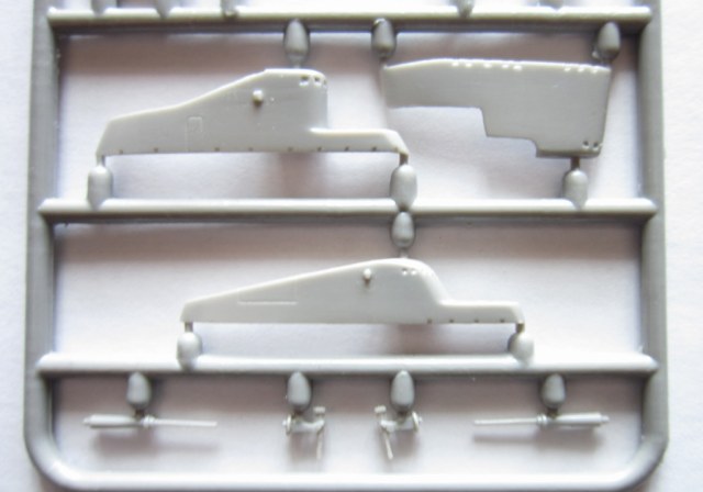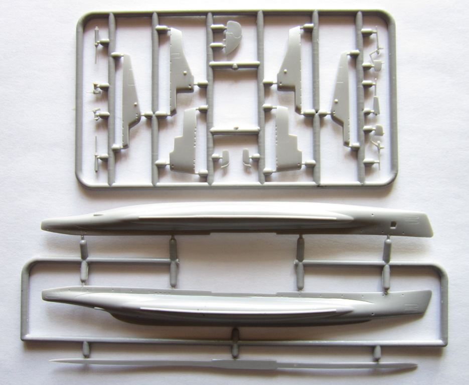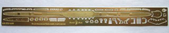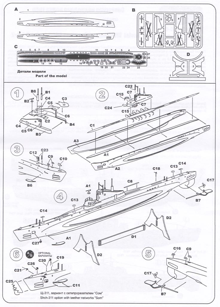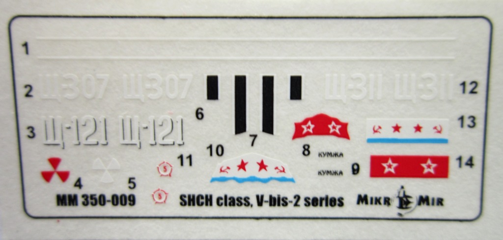 В коробке лежат две рамки с деталями серого цвета , из которых можно собрать одну ПЛ типа “Щ” V - бис 2 серии , которая показана на лицевой стороне коробки , но в наборе так же даются еще две ходовые рубки для лодок типа "Щ" Х и Х-бис серии. ( Из набора , не получится собрать модель , серии лодок типа "Щ" Х и Х-бис серии , так как фототравлением дается палуба на лодку и на ходовую рубку , только для “Щ” V - бис 2 серии ) . На этих же рамках даются , горизонтальные и вертикальные рули , выдвижные устройства и артиллерия . Утяжен и облоя на деталях корпуса нет , немного облоя есть на деталях винторулевой группы и артиллерии . К набору прилагается плата фототравления , в которой даются выше упомянутые детали палуб , леерные ограждения , поручни , винты , люки и другие мелкие детали . Еще имеется детали сетепрорезателя “Сом” , если кто захочет сделать ПЛ Щ – 311 . Декаль дает , номера лодок , военно-морские флаги и звезды с цифрой , обозначающее число потопленных судов. Еще дается рамка с деталями подставки , под модель .