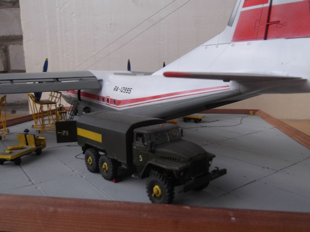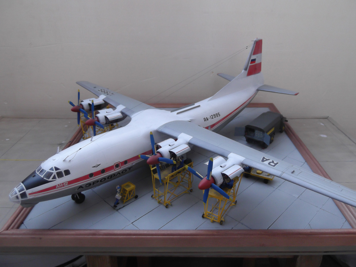 Привет всем Карупчанам. Очередной АН-12, всем знакомый до мелочей. Подробную стройку можно увидеть в "Сказках". То что хотел сделать, не сделал. После сборки фюзеляжа со всем барахлом, что я нагородил, перестал работать 3-ий мотор, освещение в кабине пилотов и хвостовой огонь. Снова ломать и искать дефекты - равносильно подрыву нервной системы, итак расшатанной во время сборки, поэтому я со слезами на глазах отрезел всю проводку, выходящую из фюзеляжа. И получился он у меня изкоробочный. Правда заглядывая за стеклышки, видно, что там все путём. Модель конечно не без огрехов. Подложка блестит номера на плоскости, и некоторые места шпатлевки особенно на фотках проявляются сильно. В реальности это так не бросается. Декали здесь полное ..., Кроме флага и номеров, все красил. Строил долго, потому что приходилось часто бросать и переходить на другие стройки. Да и работая по 5-дневке, особо не разбежишься. Красил акрилом Mr.Color. Техсостав разный, сборный, руки, ноги, головы. От Хаси и Италовский.