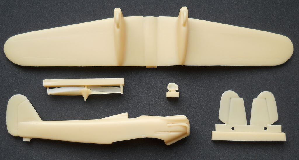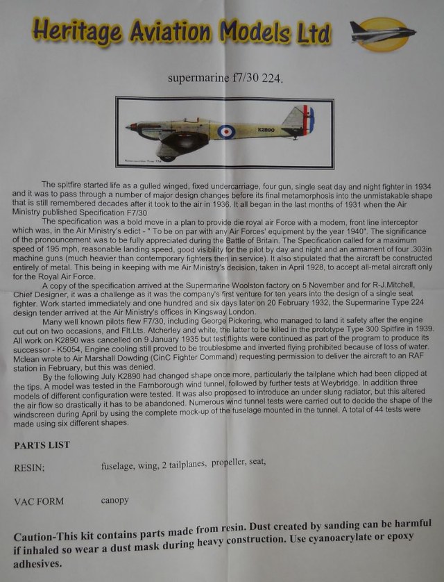 Модель от фирмы HeritageAviationModelsLtdв масштабе 1/72 из смолы. Коробка из толстого картона явно переразмерена для своего содержимого. Внутри, в пакете находятся смоляные детали, козырьки кабины, декали и инструкция. Литьё достаточно неплохого качества, дефектов и пузырей нет. Модель отличается предельно малым количеством деталей. Фюзеляж и крыло отлиты целыми деталями. Причём крыло выполнено зацело с обтекателями и колёсами шасси. Кабина даётся сквозным отверстием в фюзеляже. Из интерьера только кресло пилота. Ваку-козырёк кабины прикладывается в двойном экземпляре, но выглядит он совершенно «оплывшим». Декаль на вид нормального качества. На цветной инструкции указания по сборке отсутствуют (что не удивительно при такой деталировке), а вот информация по окраске достаточно информативна. Экономия производителя на количестве деталей не вызывает восторга. Равно как и не радует практически полное отсутствие расшивки на модели. Достаточно посмотреть на два крайних фото из приведённых в обзоре. Это ваку-модель Supermarine 224 от RairePlaine 1/72. Правда, эту «вакушку» сейчас не легко купить, а резин-кит от Heritage сейчас в продаже на их сайте.