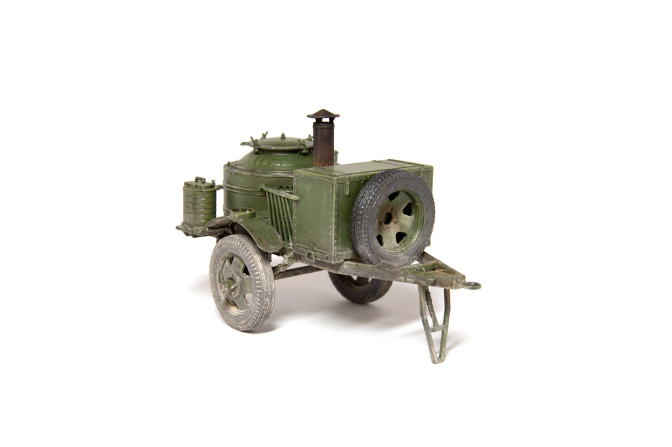 Практически "изкоробка". По требованию заказчика сделал крутящимися колеса (правда, не ахти получилось в виду отсутствия сверлильного инструмента и кривизны рук), однако, потом заказчик передумал и попросил сделать "стоящий" вариант. Из остальных доработок: удлинил заднюю подножку, чтобы доставала до земли; рассверлил крючки и кронштейны на задней стенке ящика (по материалам журнала "М-Хобби"); заменил задний шов, который над дверцей топкт (не очень удачно вышло). Жаль, поздно узнал про двухсекционную трубу, иначе стоило бы сделать. Хотел сделать подвижной разделочную доску, но не справился, очень мелкие зазоры. Один из котелков открыт так же по требованию заказчика.