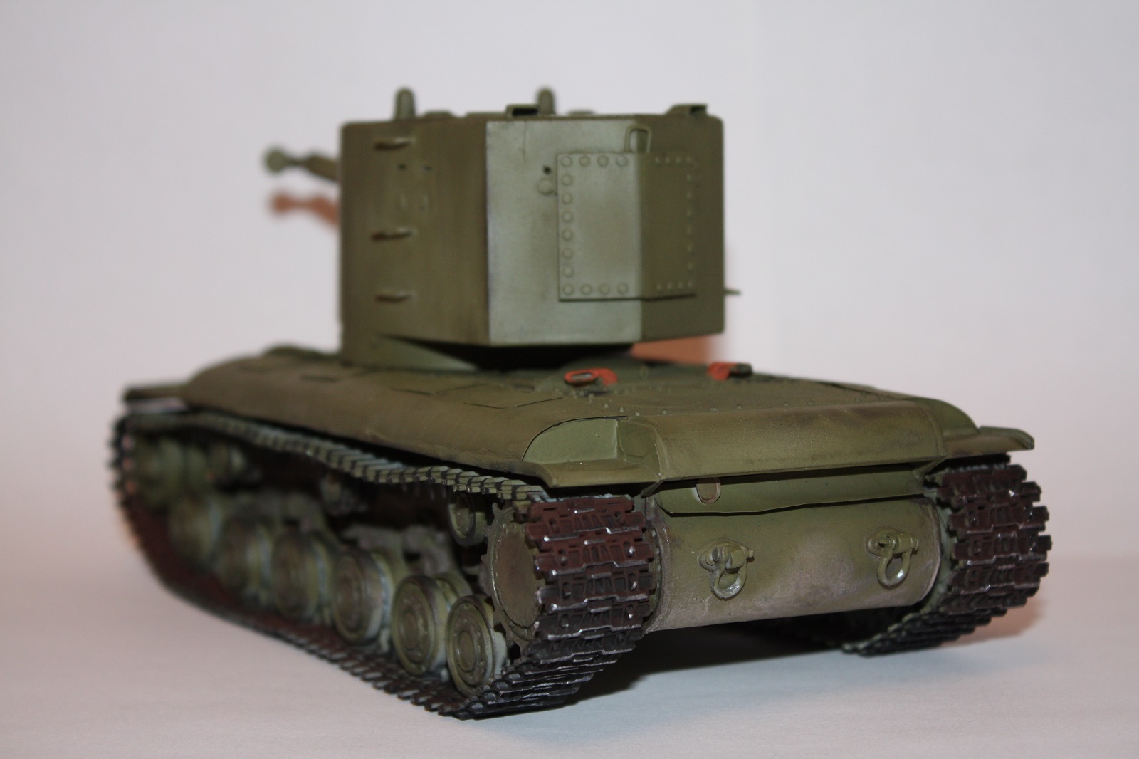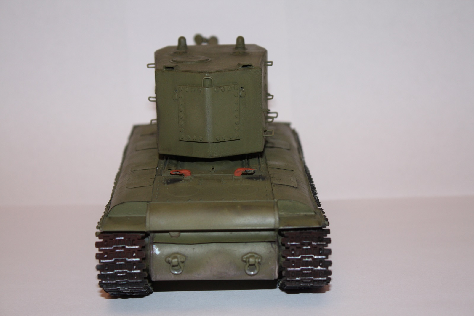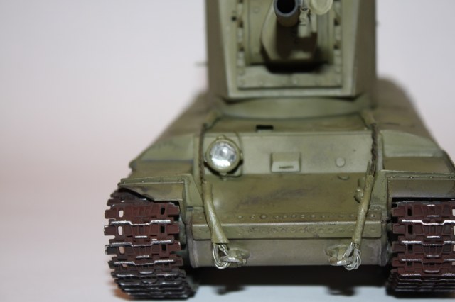 На днях завершил его. КВ-2 установочной партии, один из самых первых. Самое главное - крышечка на стволе. Не знаю как она выглядела, ибо фоток всего 3 штуки. Делал так, как считал нужным. Фара самодельная, ящички на бортах из баночного алюминия, тросы из проволоки, Ствол из гелевой ручки. Сеток на МТО не было, по-этому сделал жестяную версию.