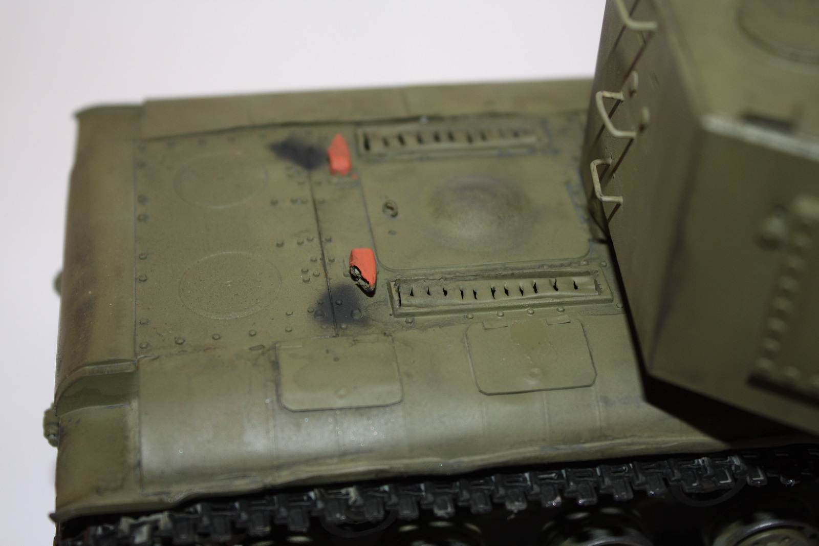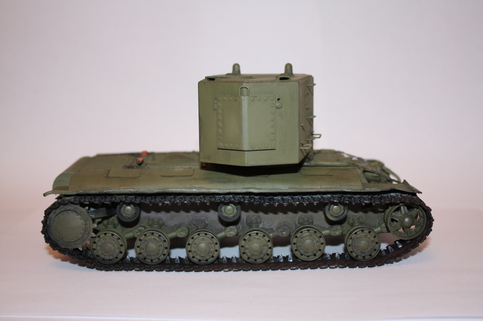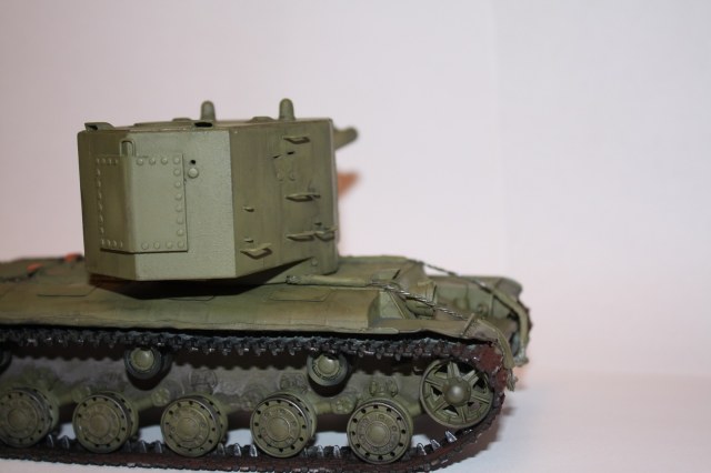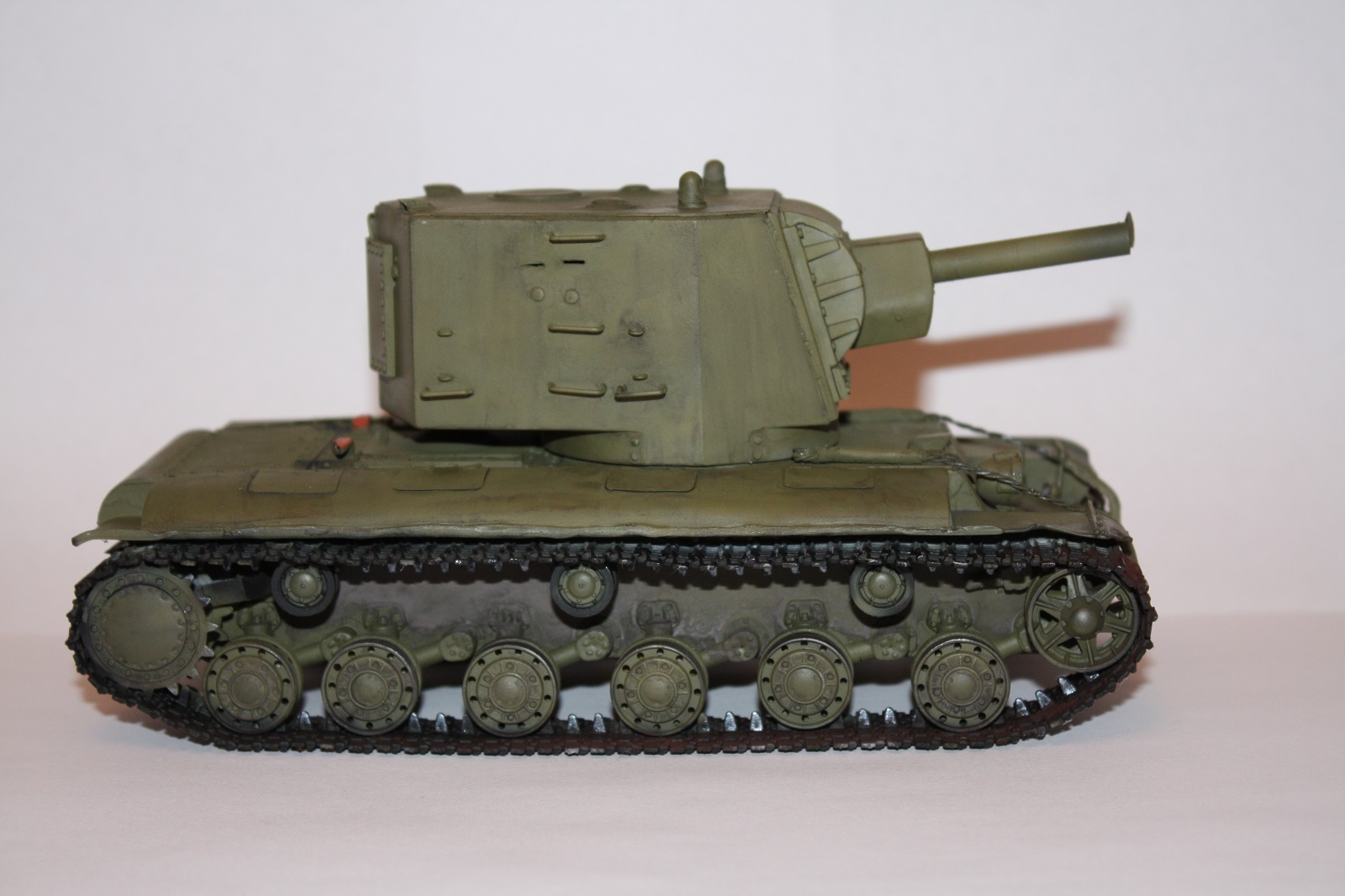 На днях завершил его. КВ-2 установочной партии, один из самых первых. Самое главное - крышечка на стволе. Не знаю как она выглядела, ибо фоток всего 3 штуки. Делал так, как считал нужным. Фара самодельная, ящички на бортах из баночного алюминия, тросы из проволоки, Ствол из гелевой ручки. Сеток на МТО не было, по-этому сделал жестяную версию.