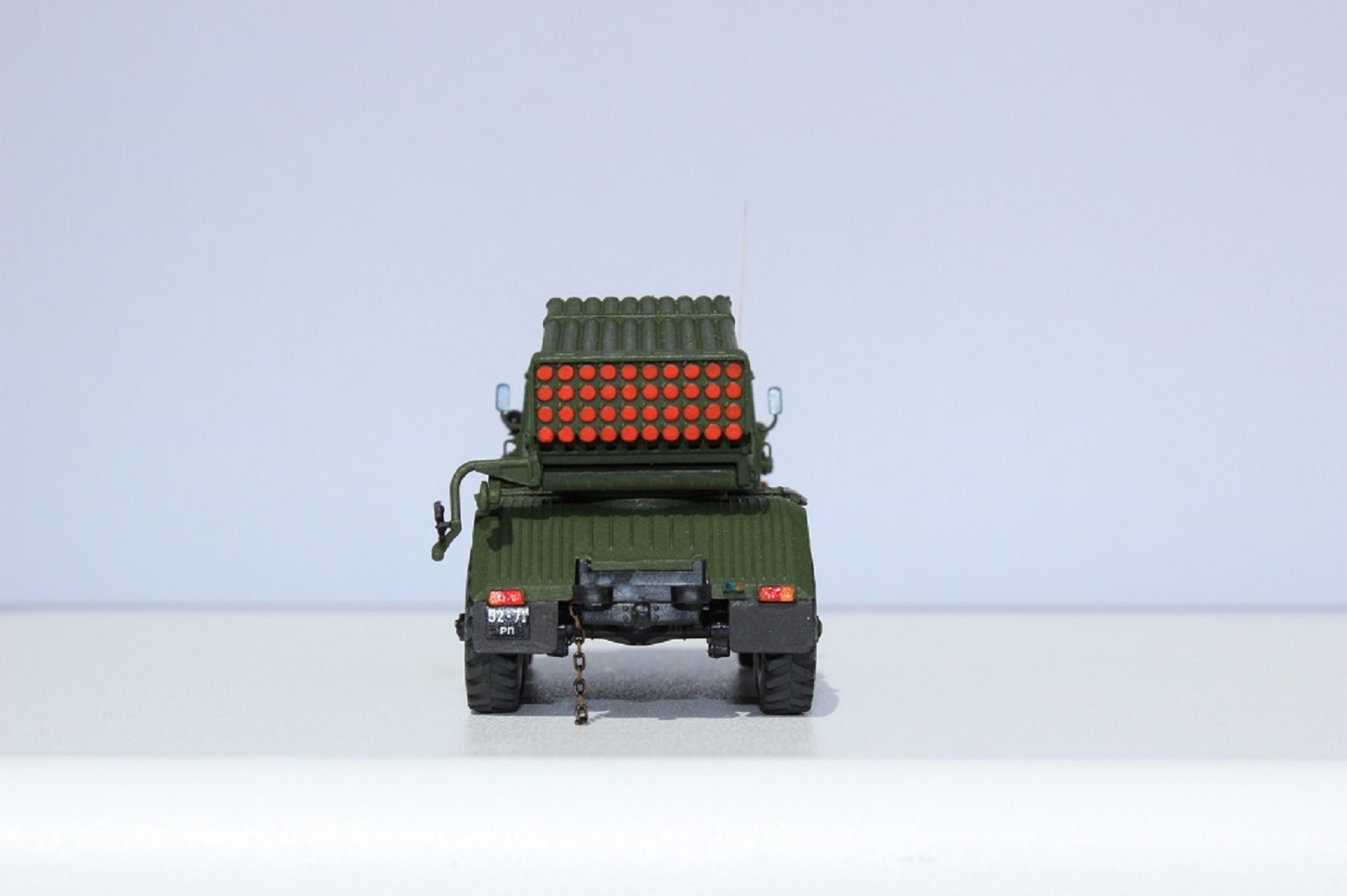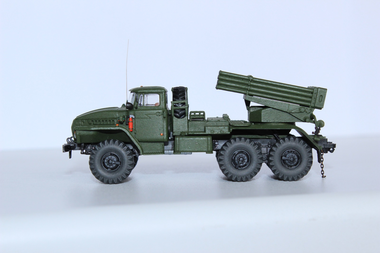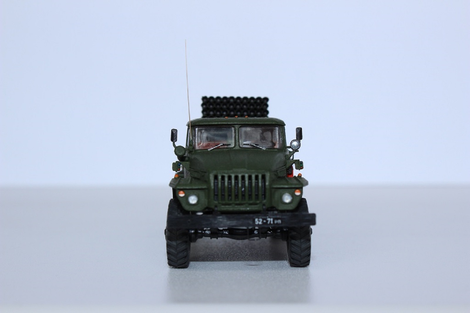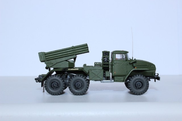 В плане доработок работа очень хороша !единственное но: не стоит слепо верить википедии,у вас простая установка бм 21 ,но на шасси урал 4320. у бм21-1 пакет направляющих в коробе и это основное визуальное отличие,плюс ещё по мелочи они различаются.По окраске - не хватает смывки.Смывку можно попробовать изготовить самому - самый простой вариант черная гуашь и фэйри.Чуть посложнее масляная краска и уайт-спирит.
