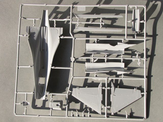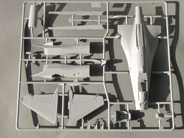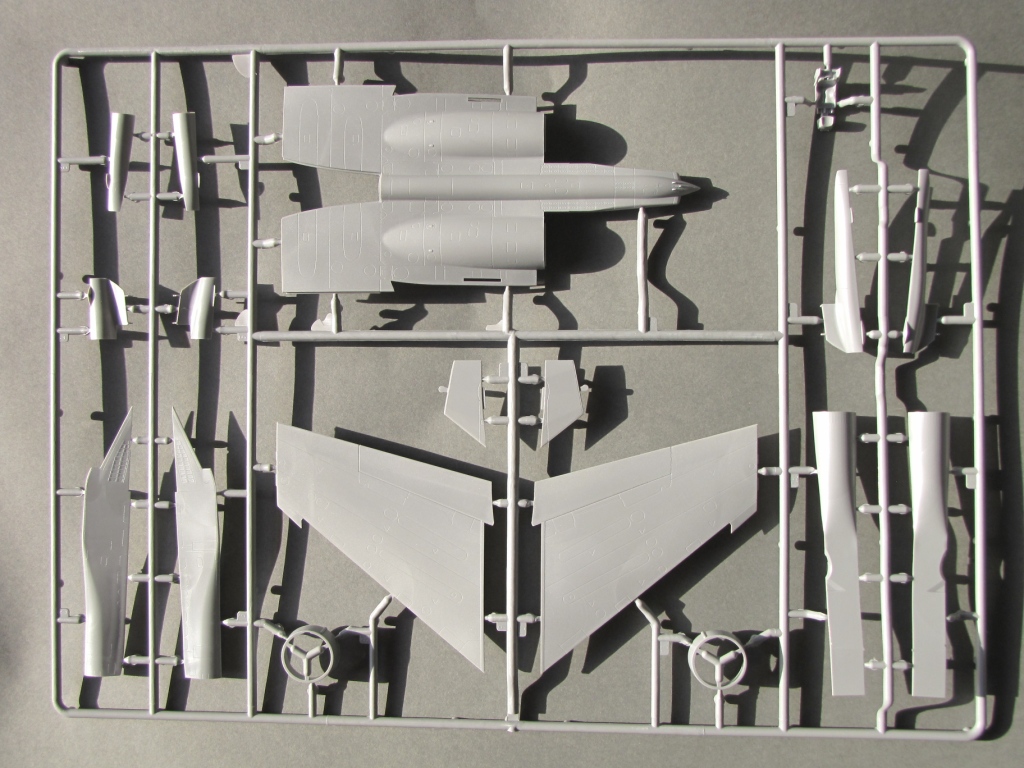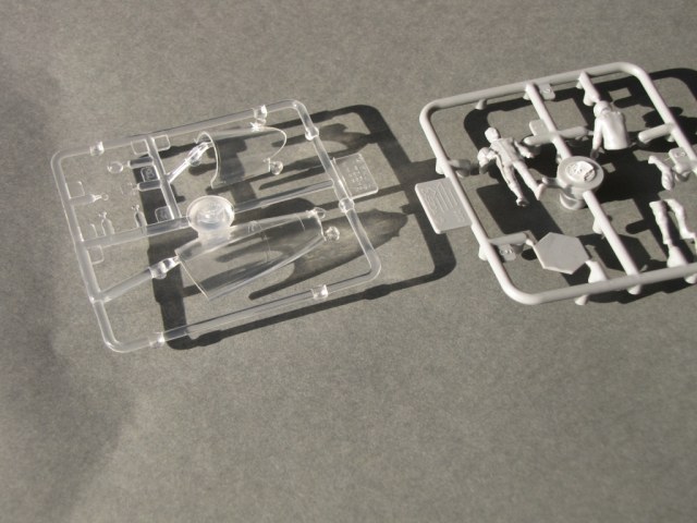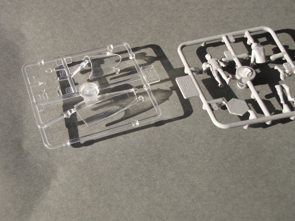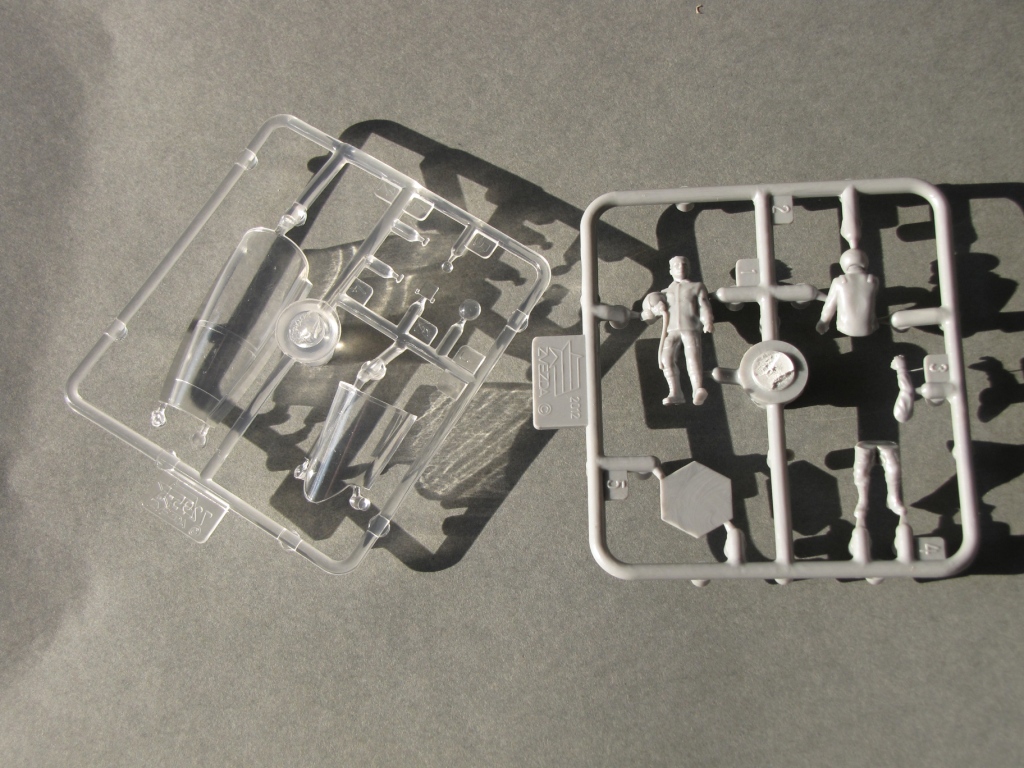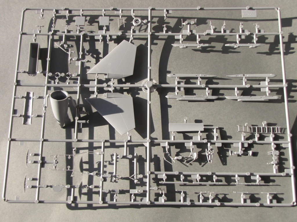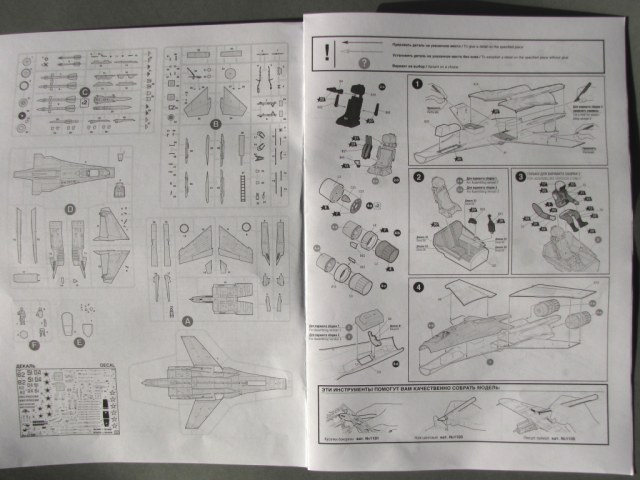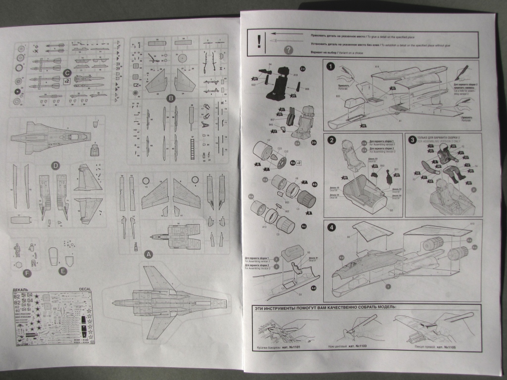 В коробке лежат шесть больших литников серого пластика, каждый в отдельном пакетике, один маленький (фигурки пилота) и прозрачный - фонарь (действительно прозрачный и тонкий); декаль на три варианта с многочисленной техничкой; инструкция на 4-х листах формата А4.