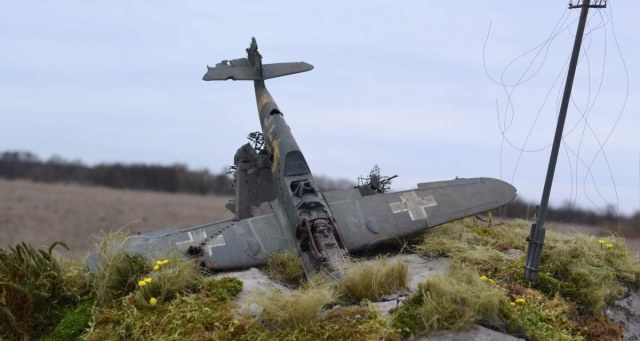 Без фона будет просто модель разбитого самолёта (причём, довольно неестественно разбитого), а с фоном создаётся вполне себе законченная картина. Причём - цельная картина, пусть даже и не совсем удачная по компоновке (про матчасть не берусь судить).