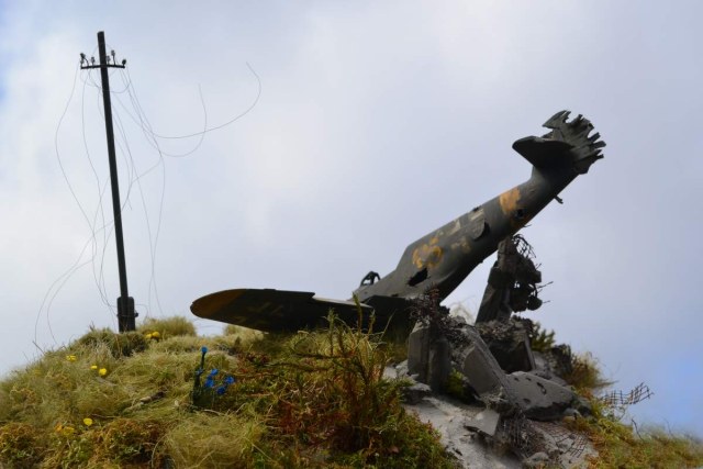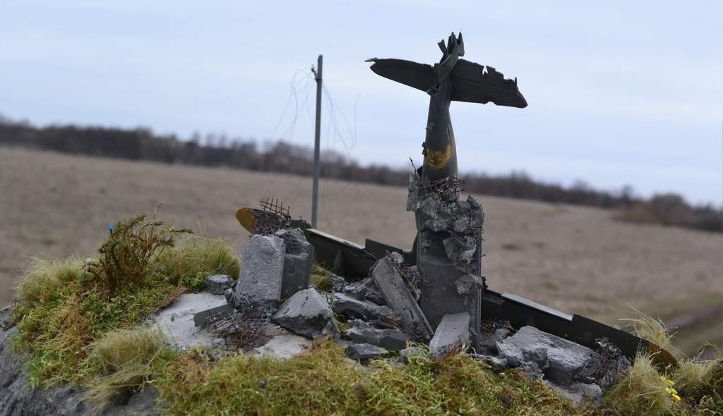 Однако имитация повреждений не внушает. Виден попиленный пластик, а не порванная ткань, пробитый люминь и пр. на руле напрвления должен был остаться каркас (на последнем фото виден именно он с немногочисленными остатками ткани), ровного ряда пулевых пробоин не будет никогда- уже на дистанции 100 м разброс составляет порядка 15-30 см. Обращаясь к вами привелённому фото прототипа замечу, что самолёт скапотировал о развалины и уперся в стену, а у Вас он видимо снёс что-то железобетонное и остался цел(???)