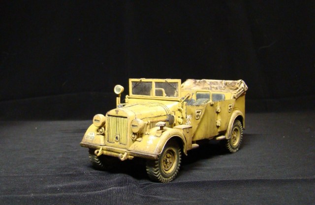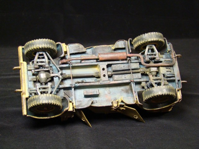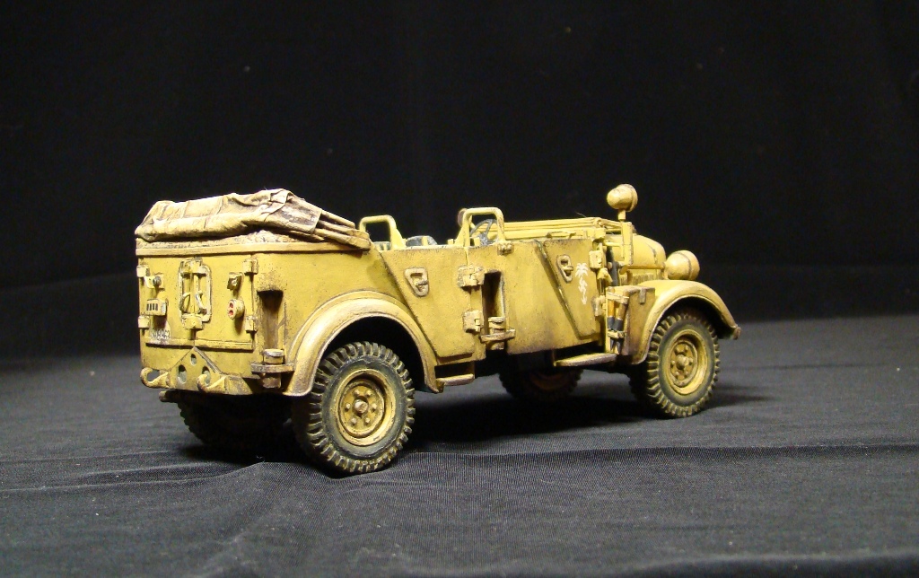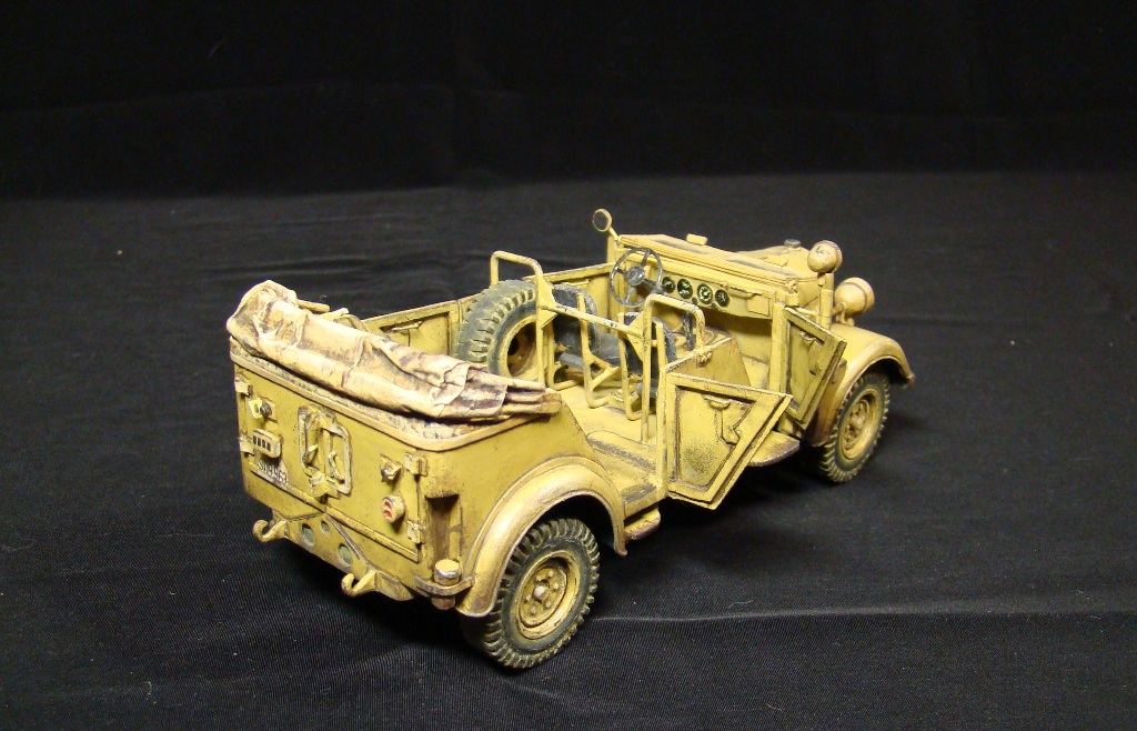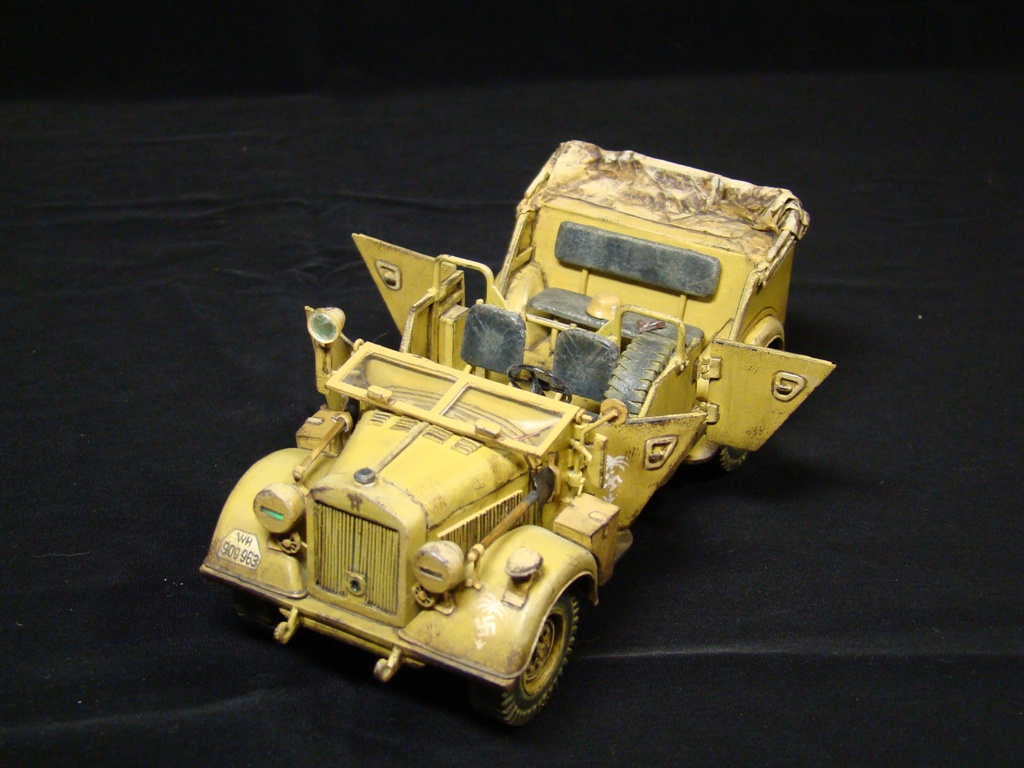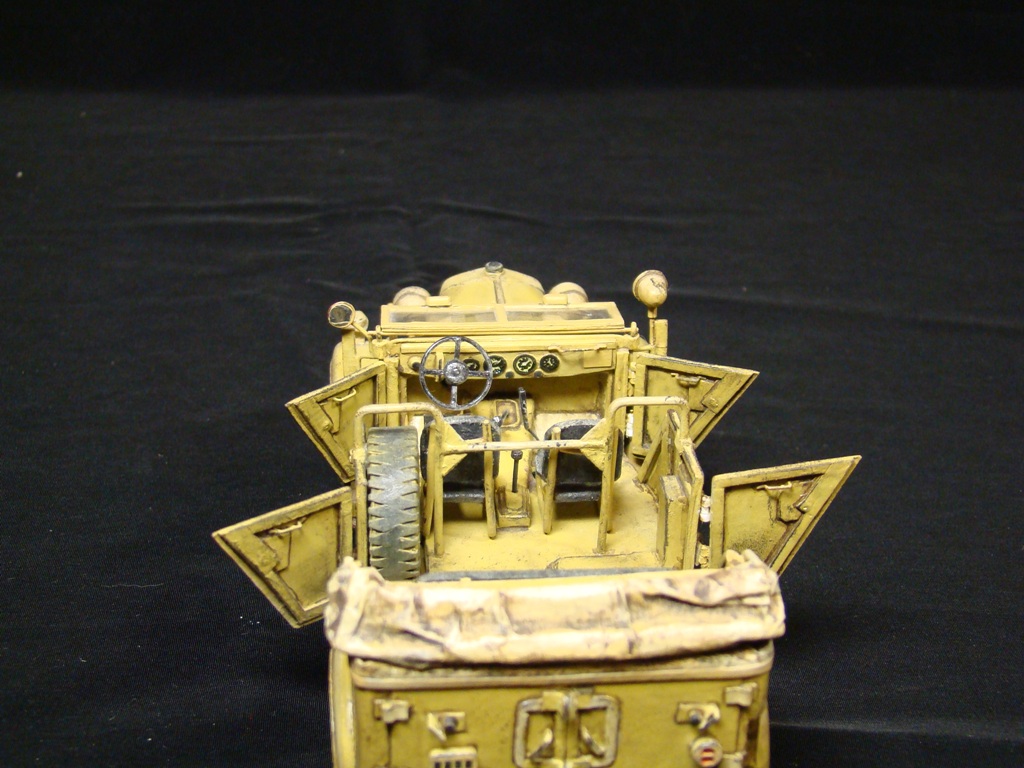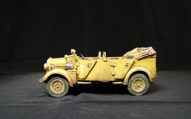 Это была штабная машина Роммеля (одна из них). У модели сделаны открывающимися двери и откидывается лобовое стекло. Так же полностью сымитирована подвеска. Ручки инструмента –деревянные.
