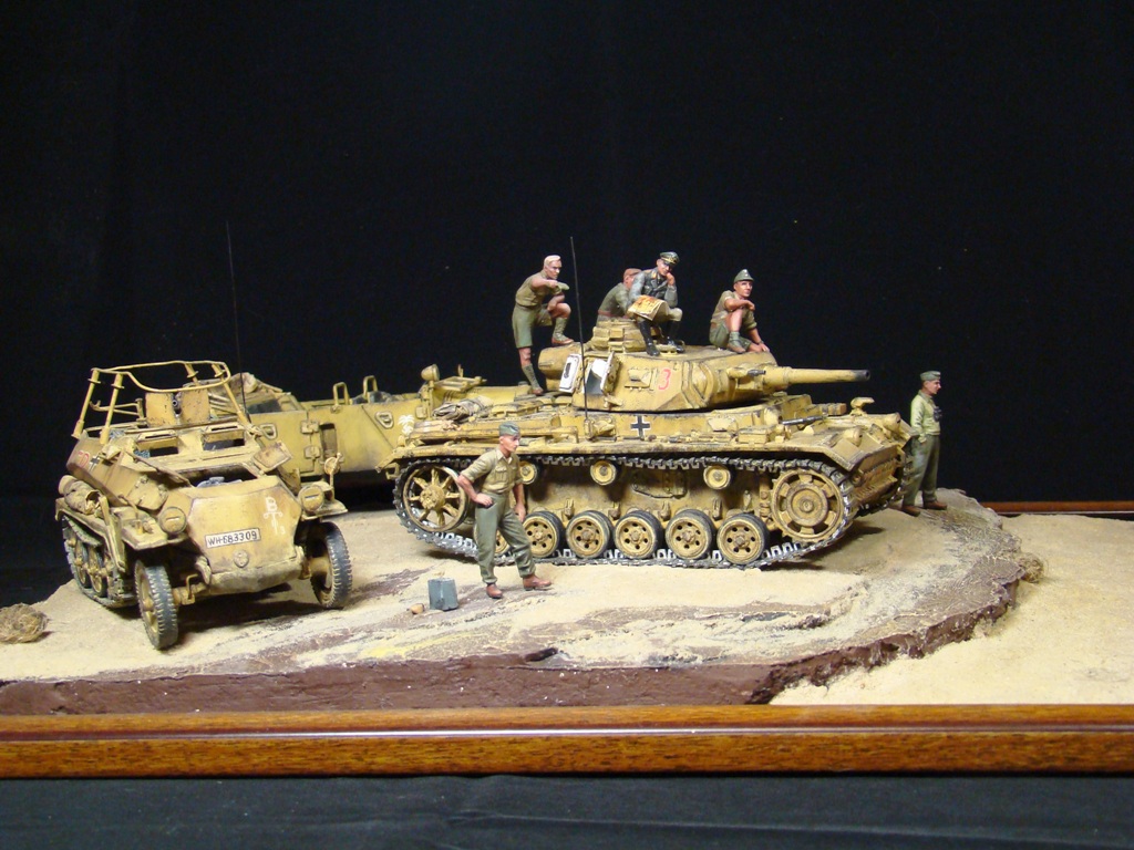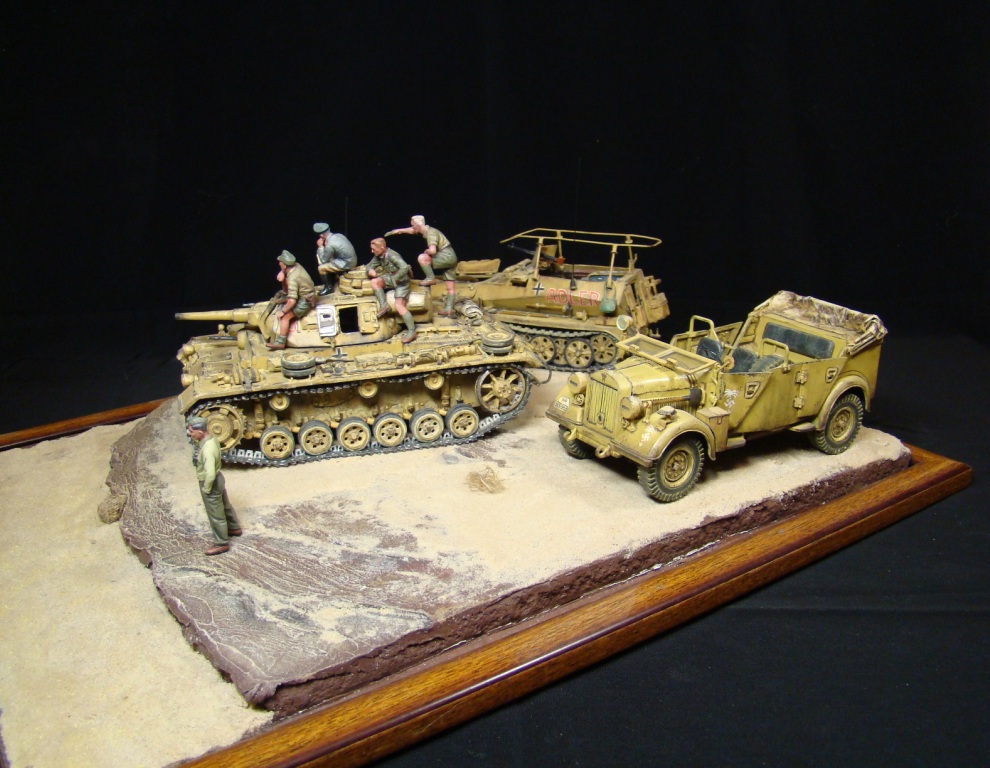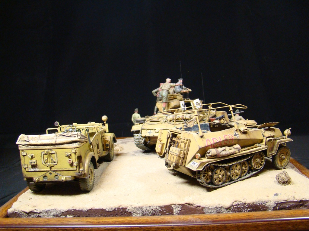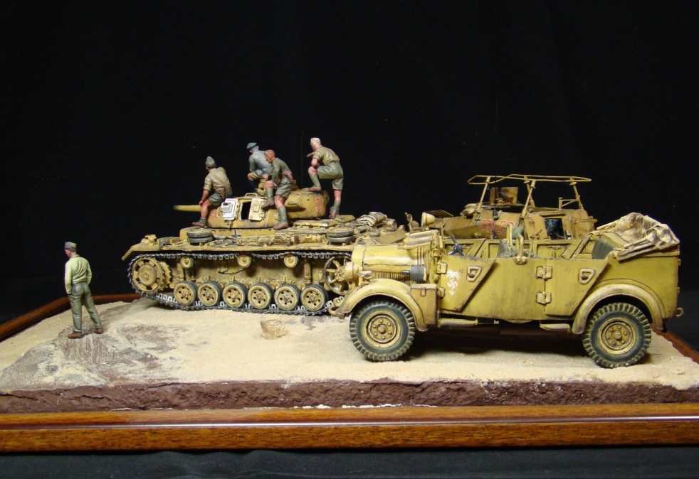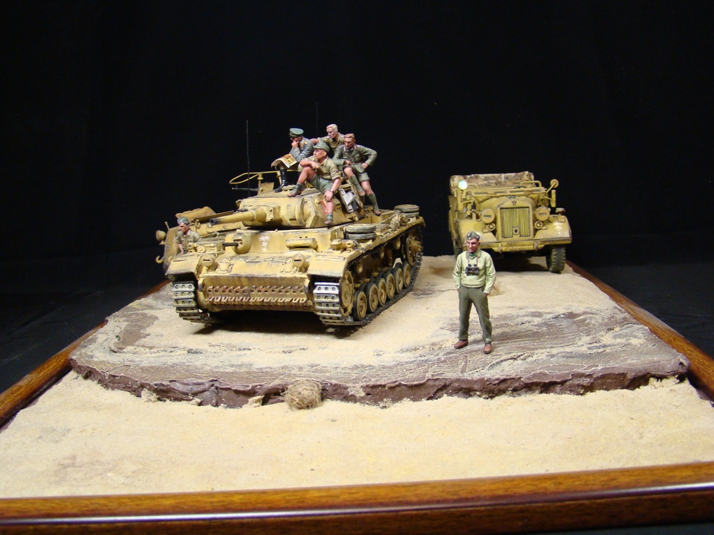 Доброго времени суток коллеги моделисты! Представляю Вашему вниманию свою работу- диорама «Пустынный ЛИС». Обыграна сценка с командуюшим танковыми силами «Африканского корпуса» германских войск Эрвином Роммелем, который получил прозвище «Лис пустыни».