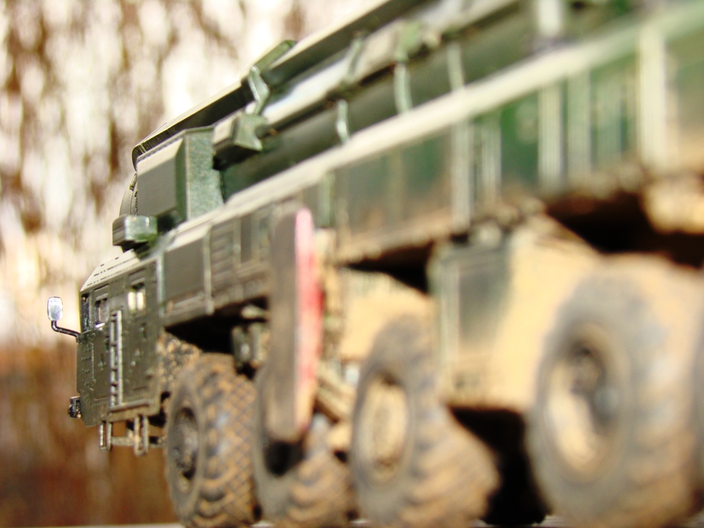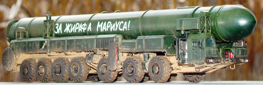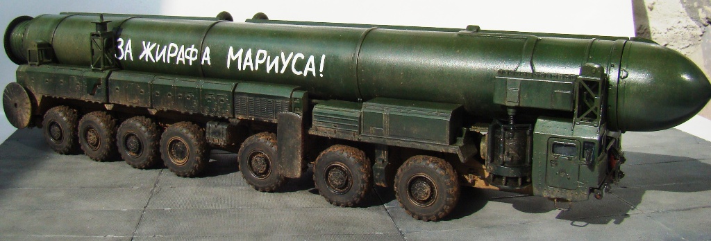 Одним из самых удачных российских современных комплексов считается мобильный грунтовой ракетный комплекс «Тополь» с ракетой РС-12М на базе семиосного шасси большегрузного автомобиля МАЗ.В коробке не плохой набор но при сборке следует обратить внимание на : 1.Все контейнеры желательно собирать не по инструкции а по отдельности а потом поставить на раму,2.Кабины,переднею панель которая состоит из лицевых панелей и бампера желательно распилить и собрать кабины отдельно 3.остекление в наборе от зведы ужасного качества. 4.Петли соединения рамы и лафета под контейнер ракеты надо усилить.Что смог доработал по мелочам,набор не просто просит а умаляет о большой плате фототравления. За надпись не обессудьте делал по демотиватору,на украине это сейчас больная тема