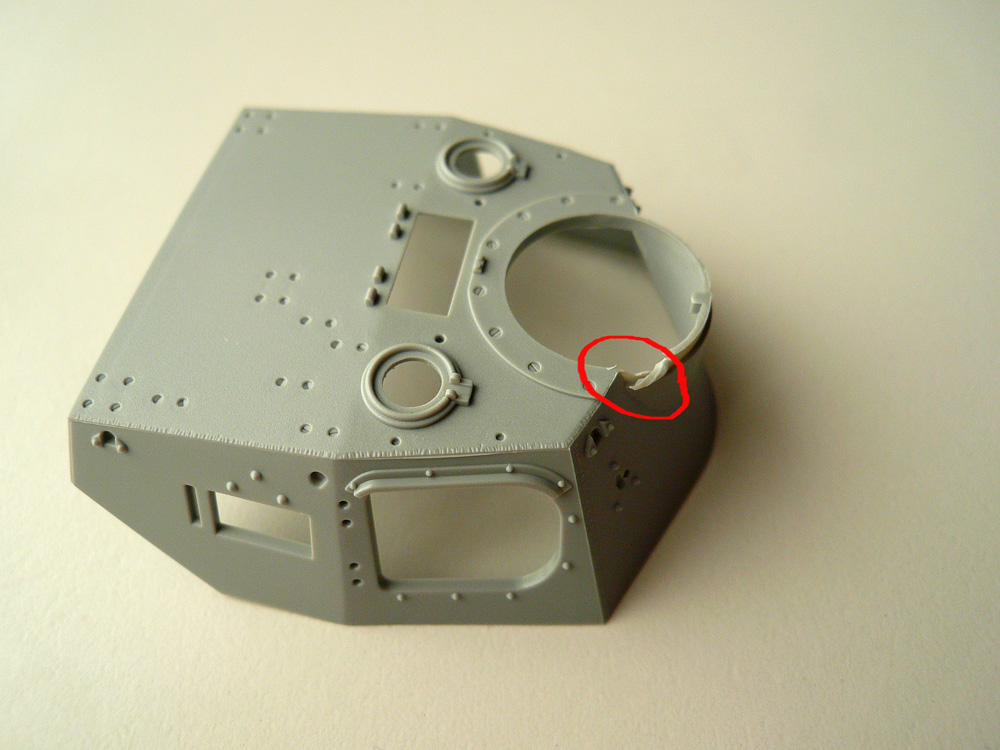 "Мощные ручищи" китайсих упаковщиков так старались что повредили башню (на фото обведено красным). Причем, согласно инструкции, довольно большое количество пластика не используется при сборке.