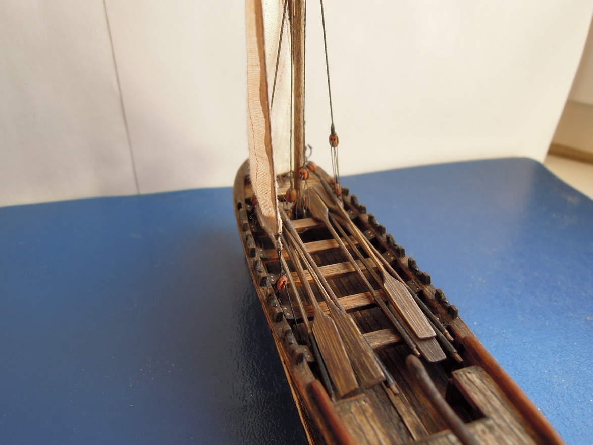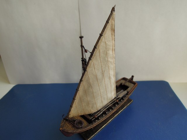 Вот,получается,что правильно я вчера воздержался от комментариев.Поздно было,устал....А уж сегодня.....Сережа,в общем и целом работа хорошая.Сразу скажу-в галерею можно вполне.Все замечания прими к сведению на следующих.Во-первых,парус ужасная дерюга,но выглажен на славу,а должен быть надуто-помятый.Во-вторых,найди доступ к швейной машинке,купи,наконец детскую или карманную.Стоит-то гроши,а порядок исполнения будет горааааздо выше.И строчи через бумагу.В-третьих- режет глаз планширь в носу.Этакая наглая фанера.А надо гнуть ,батенька,гнуть реечку из массива.Это не трудно.И на весла дерево бы взять не с такими зверскими волокнами.Текстура дерева разрушает восприятие.Из любого мелкослойного дерева они были бы гораздо изящнее.Клен,груша,вишня,яблоня,даже ольха или осина.