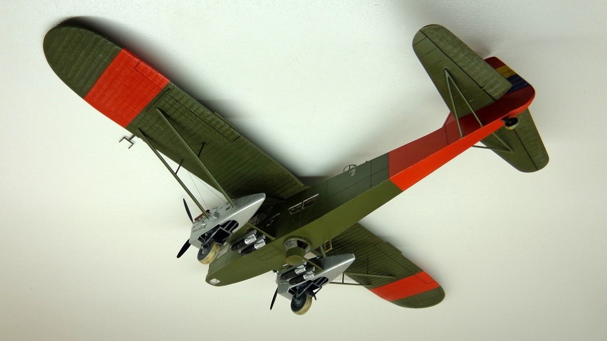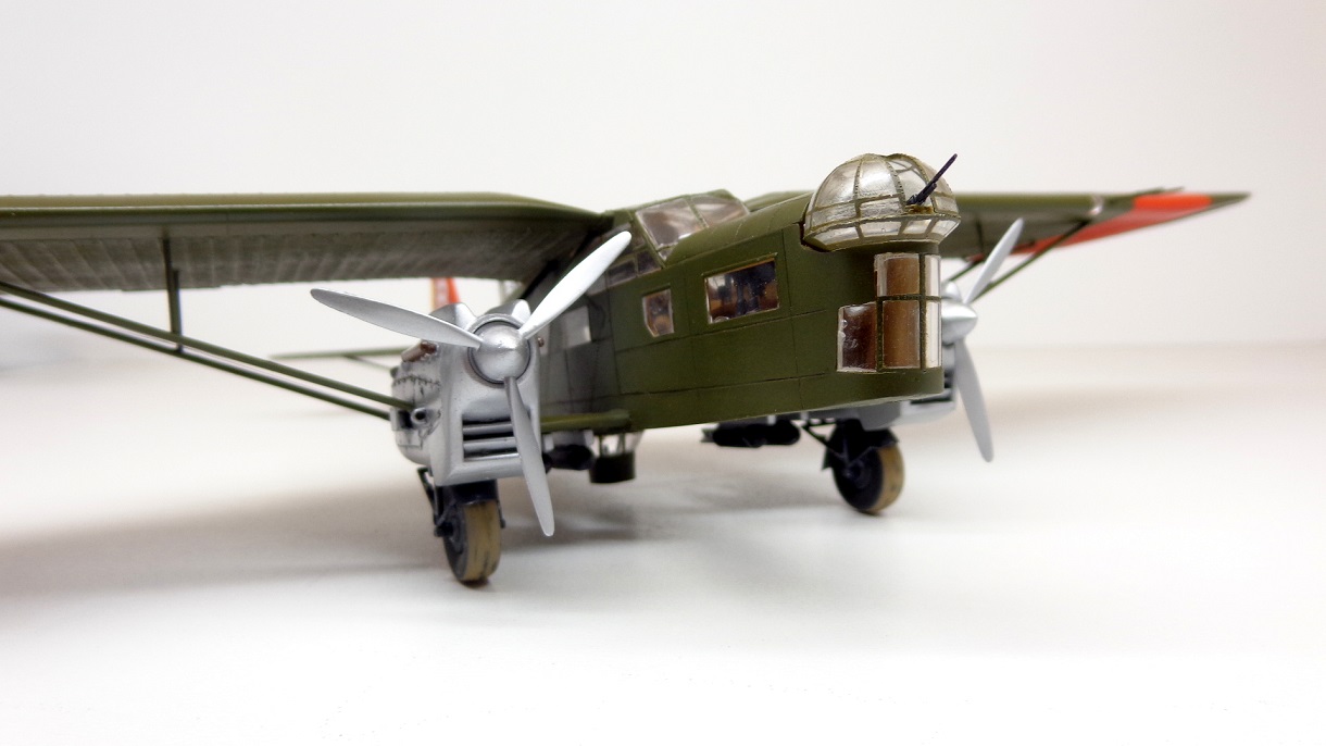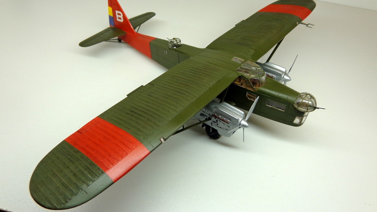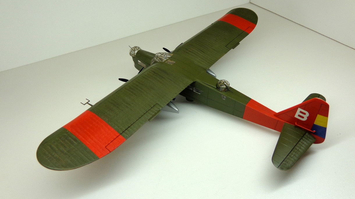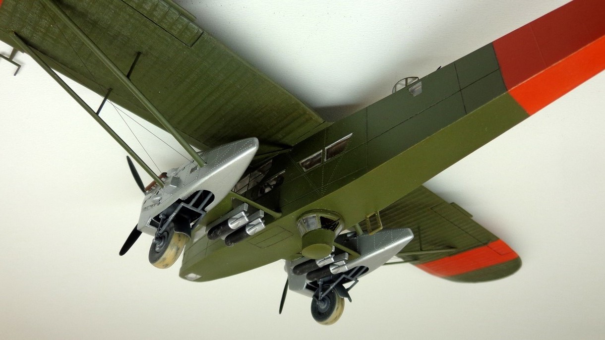 Моделистам старшего поколения эта модель хорошо знакома как под маркой "SMER", так и "Heller". Учитывая компоновку модели и ее окраску я собирал модель отдельными узлами с предварительной окраской - фюзеляж, крылья с подкосами, стабилизаторы с подкосами, моторы со стойками шасси, винты, стрелковые башни. А потом всё это, уже предварительно окрашенное, склеивал между собой, поэтому возникли щели в местах склейки.Также я попытался изобразить "раскрой", но получилось плохо. По видимому, эта "технология" не для меня. В общем, модель как то вышла не совсем такой, как хотелось первоначально. Не доволен я собой. Кстати, может кто подскажет, что не так у меня получилось?