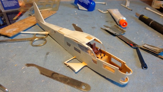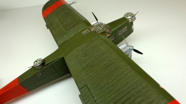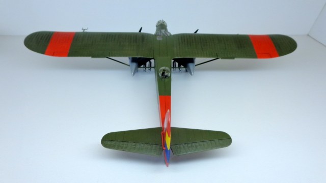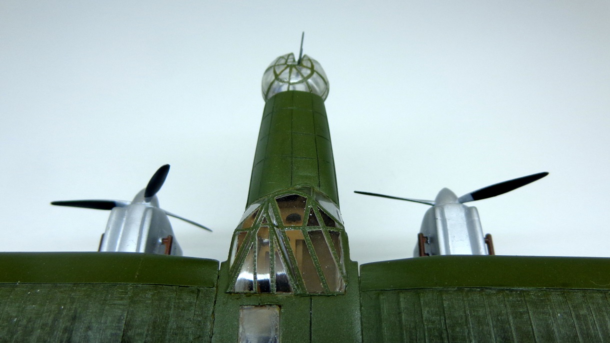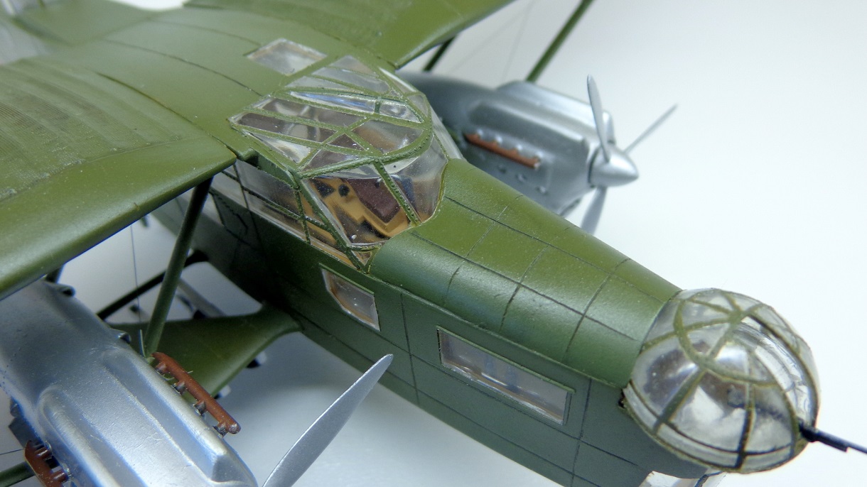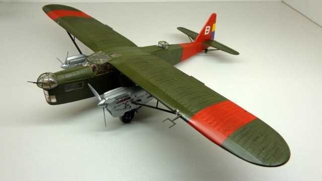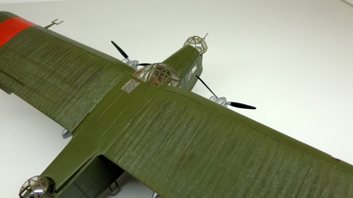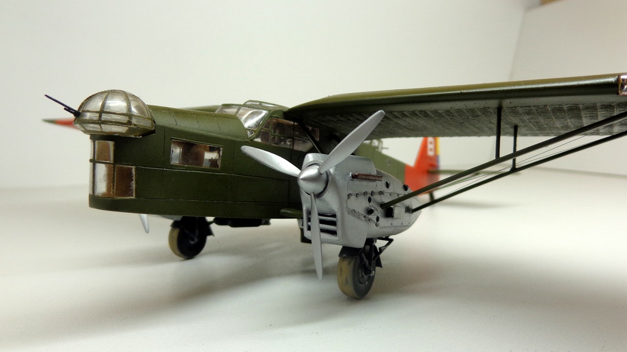 Моделистам старшего поколения эта модель хорошо знакома как под маркой "SMER", так и "Heller". Учитывая компоновку модели и ее окраску я собирал модель отдельными узлами с предварительной окраской - фюзеляж, крылья с подкосами, стабилизаторы с подкосами, моторы со стойками шасси, винты, стрелковые башни. А потом всё это, уже предварительно окрашенное, склеивал между собой, поэтому возникли щели в местах склейки.Также я попытался изобразить "раскрой", но получилось плохо. По видимому, эта "технология" не для меня. В общем, модель как то вышла не совсем такой, как хотелось первоначально. Не доволен я собой. Кстати, может кто подскажет, что не так у меня получилось?