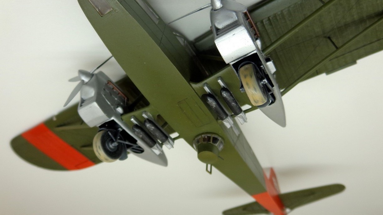 В модели отсутствовало бомбовое вооружение, поэтому изготовил его сам, примерно похожее. Пулеметы в модели отчасти напоминающие французские "Дарн", я заменил на другие, т.к. на испанских машинах ставили "Виккерсы". Самый заметный "косяк" разработчиков модели - неверная форма верхней турели, на подавляющем большинстве самолетов она была иной формы, более сплющенной что-ли. Я не пытался её изменить.