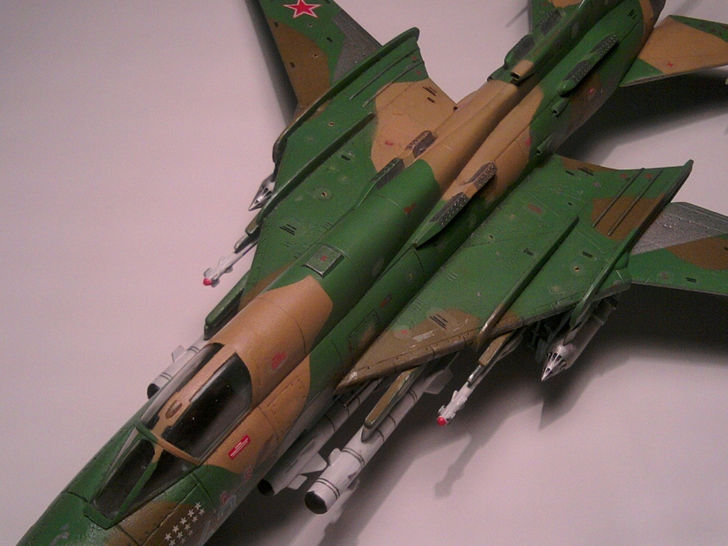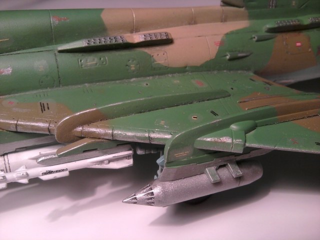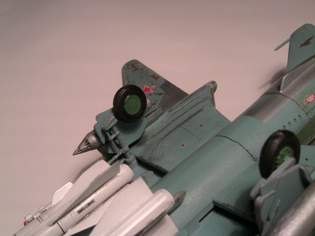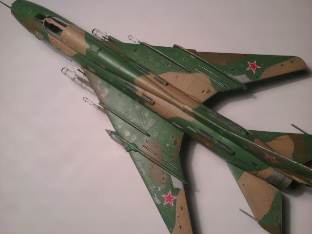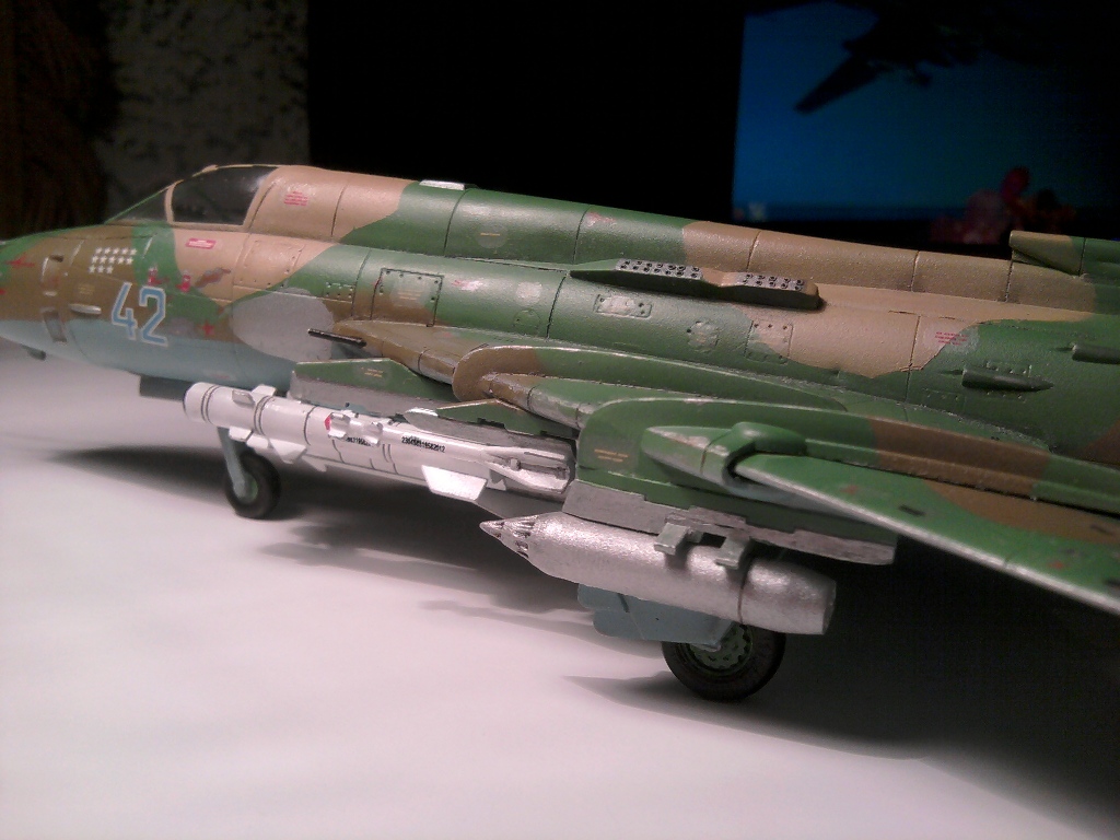 Нормально так с Мастеркрафтом поработали. Собран и покрашен вроде ровненько. Только вооружен до зубов. Тут тебе и УР В/З, и КАБы, и НАРы, короче сборная солянка, едва ли такая подвеска могла быть в реале, на статической экспозиции разве что. КАБ-500Кр, кстати должны быть серыми.