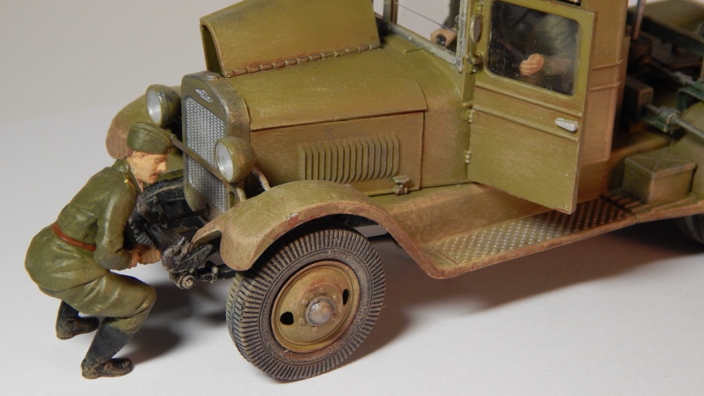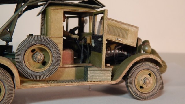 На подножках отсутствует выштамповка (см. фото прототипа). Створки капота не масштабной толщины (раз открыли). Вообще у ВЭ, Алана капот и лувры далеки от истины. У задней стенки кабины тож неверны выштамповки. Вроде же у катюши другая задняя стенка в наборе, не? С сидухой не совсем понял, не была она до пола. Такие мелочи, как: дворник, ручки дверей и т.д. Тоже лучше засамоделить. Шовчик на покрышках напрягает, да и диски не плотно к резине прилегают. По самой установке, если честно не копал, не подскажу. Ну, вот так навскидку, что вспомнил. Вообще, тут есть что попилить. Фото должны быть на однотонном фоне, т.е под саму модель тоже надо было белый лист положить. А фигурки я бы и вовсе убрал. По окрасу, по мне так объема не хватает. Я бы смывку по контрастнее нанес.