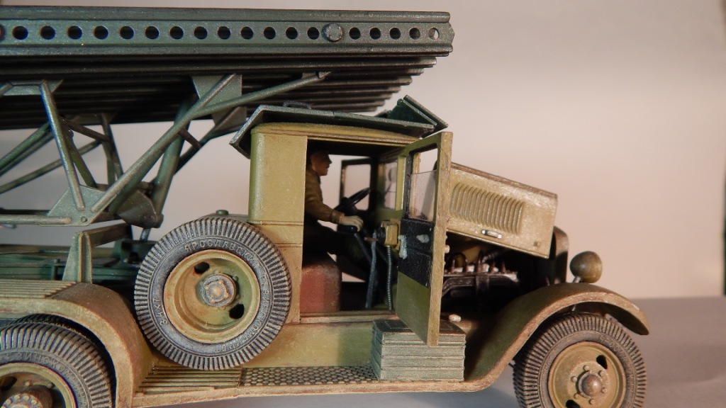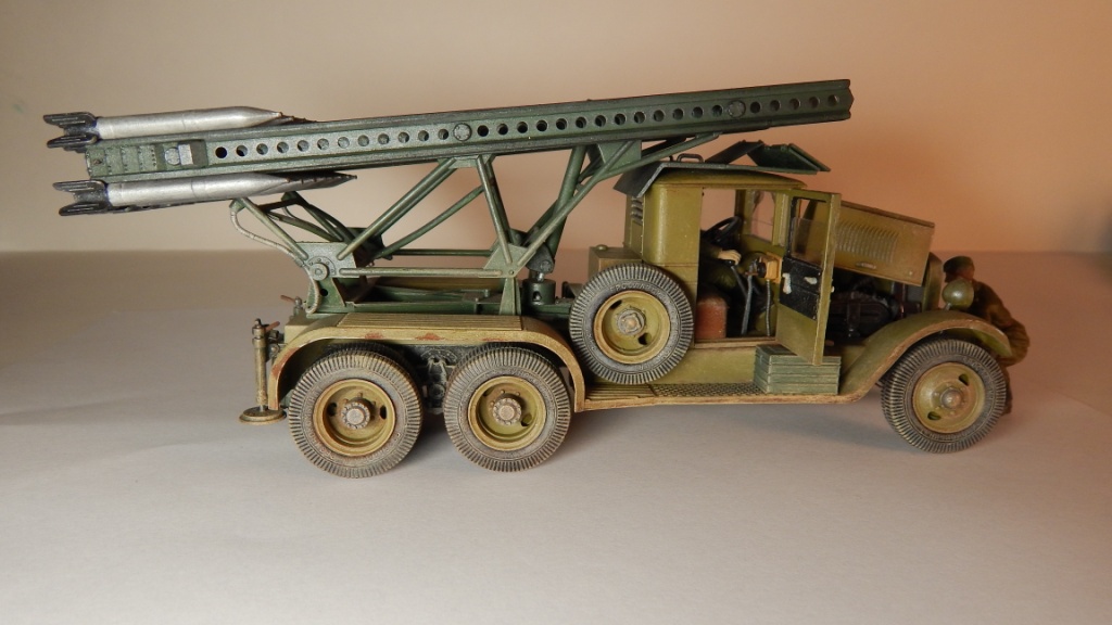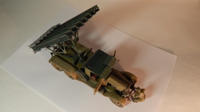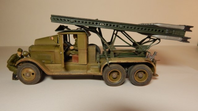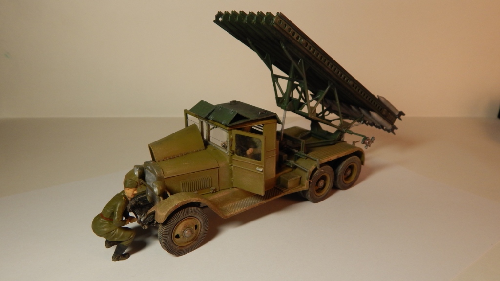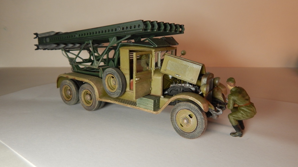 Модель "Катюши" собиралась мной более года. В процессе сборки (битвы с Восточным Экспрессом) стал интересоваться историческими событиями связанными с БМ-13. Находил военные фото, разные советы по сборке "катюш" на форумах моделистов. Это мой первый опыт создания модели с доработками и окраской делающей модель "живой". Самостоятельно были изготовлены: буксирные крюки, поворотная лебёдка, зеркало заднего вида, кабель каналы от фар и на пусковой установке, ящик ЗИП сзади, заменён ящик пускового аккумулятора, пульт старта в кабине и её защита (такой вариант защиты кабины на ЗИС-6 нашёл на фото времён ВОВ в и-нете). Добавил экипаж, с расчётом в дальнейшем сделать модель участником диорамы. Сразу прокомментирую двухцветность окраса: документального подтверждения не нашёл, но теоретически такая возможность очень даже была. Нашёл упоминание о жалобах на низкое качество окраски ЗИС-6 поставляемых для монтажа пусковой установки и предполагаю, что не все их перекрашивали в один цвет с ПУ. Это я попытался отразить на модели "заржавив" и "облупив" ЗИС-6.