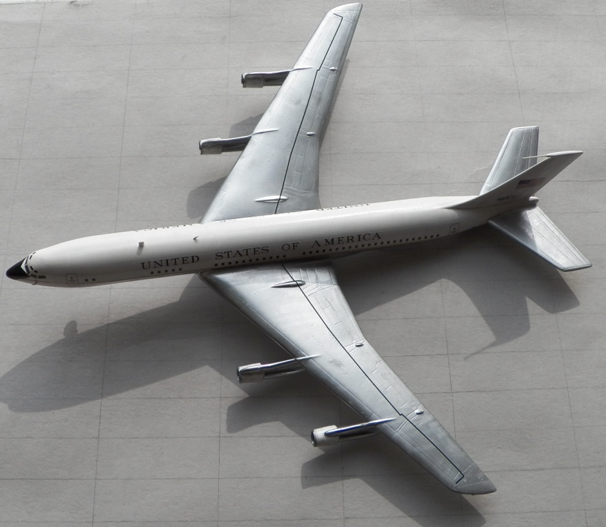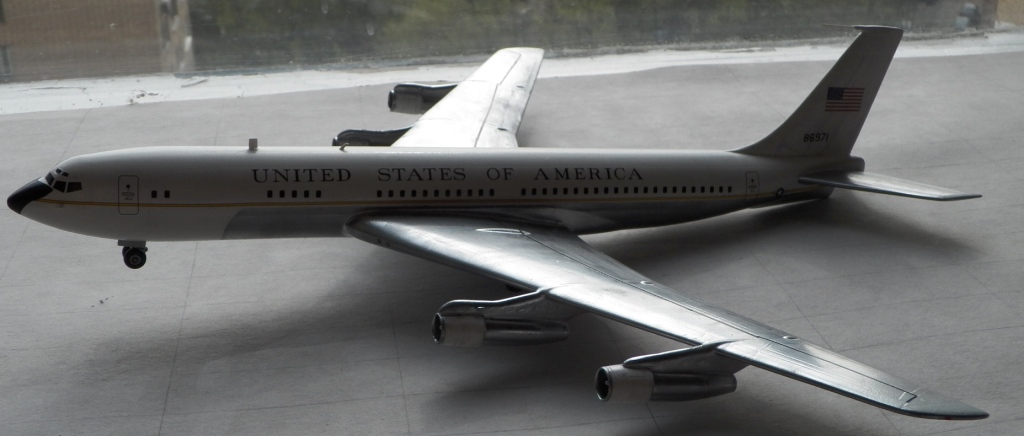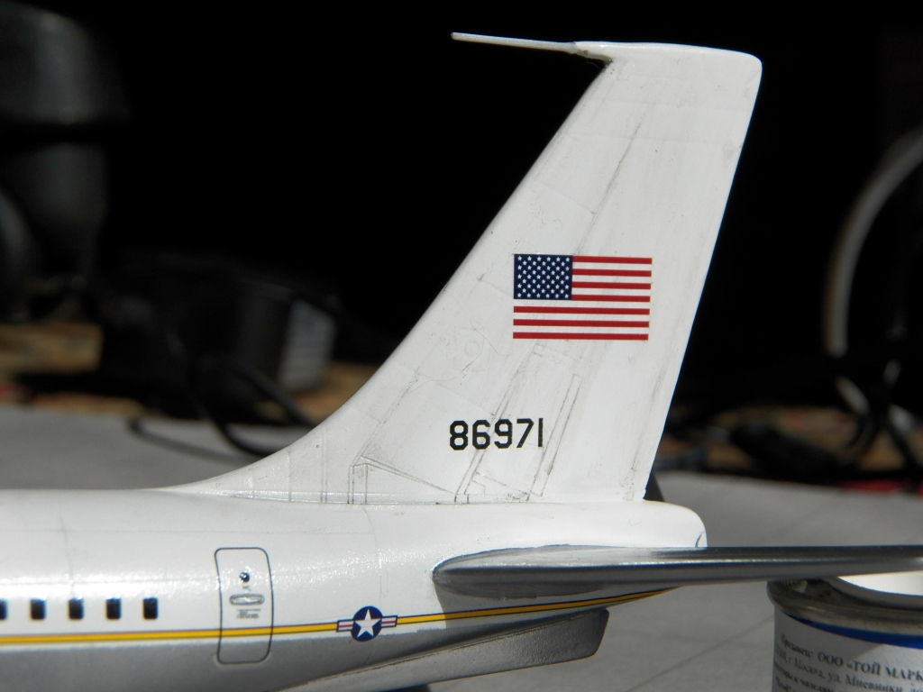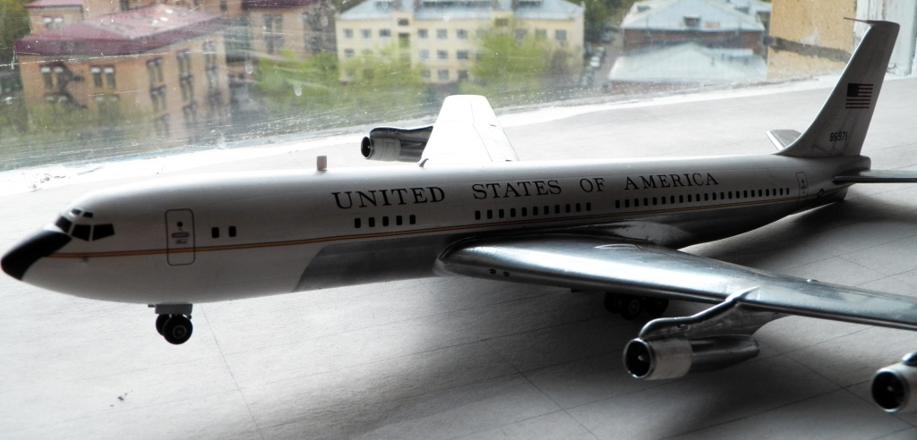 Всем привет, давно ничего не выставлял, все времени нет, вот домучил свой очередной 707, но в модификации ВВС США. Сборка проблем не составила, хотя шпатлевку использовал прилично много, как всегда был геморрой с покраской хрома, задувался дважды. Граница немного рваная, из-за старого скотча, я полагаю. Решил выпендриться и добавить проблесковый маячки на крыльях, просверлил посадочный фары и натыкал антенн. Сказать то больше и нечего, вроде, настоящий борт вывозил участников дипломатической миссий из Ирана - приятного просмотра.