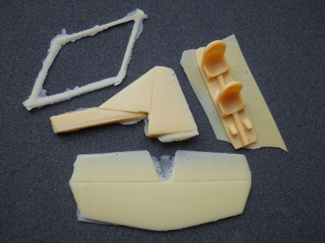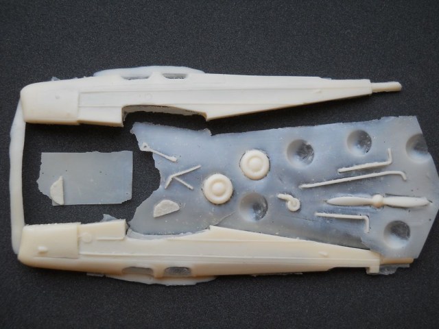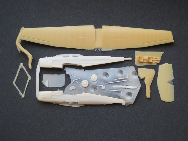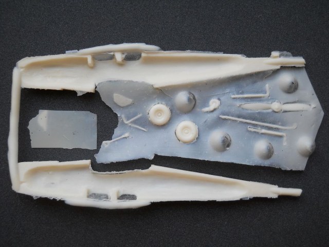 Литьё среднего (для Dujin) уровня, есть немного мелких пузырей. Фюзеляж – пустотелый из двух частей, крыло цельное. Общее количество деталей не велико. Интерьер кабины предельно прост. «Мелочёвка» потребует доработки и замены. Ваку-козырьки прикладываются в двойном комплекте. Декали в данном наборе начали обсыпаться от старости, придётся подбирать коды или печатать заново. В инструкции содержится краткая историческая справка с указанием источников и информация на три варианта окраски.