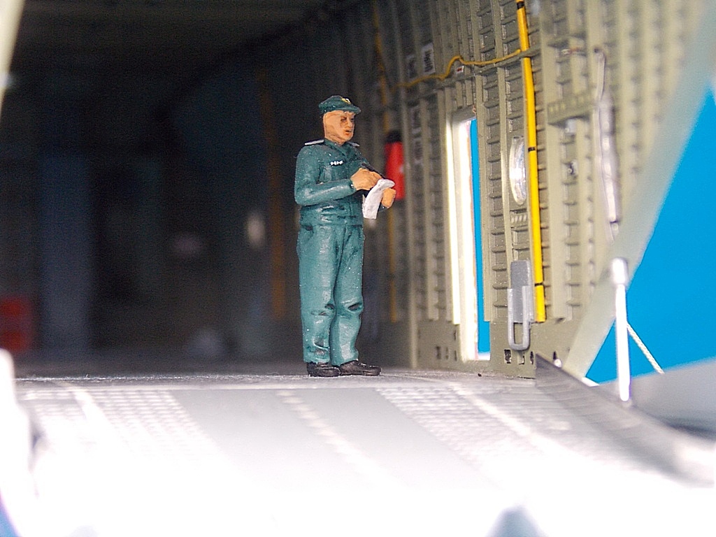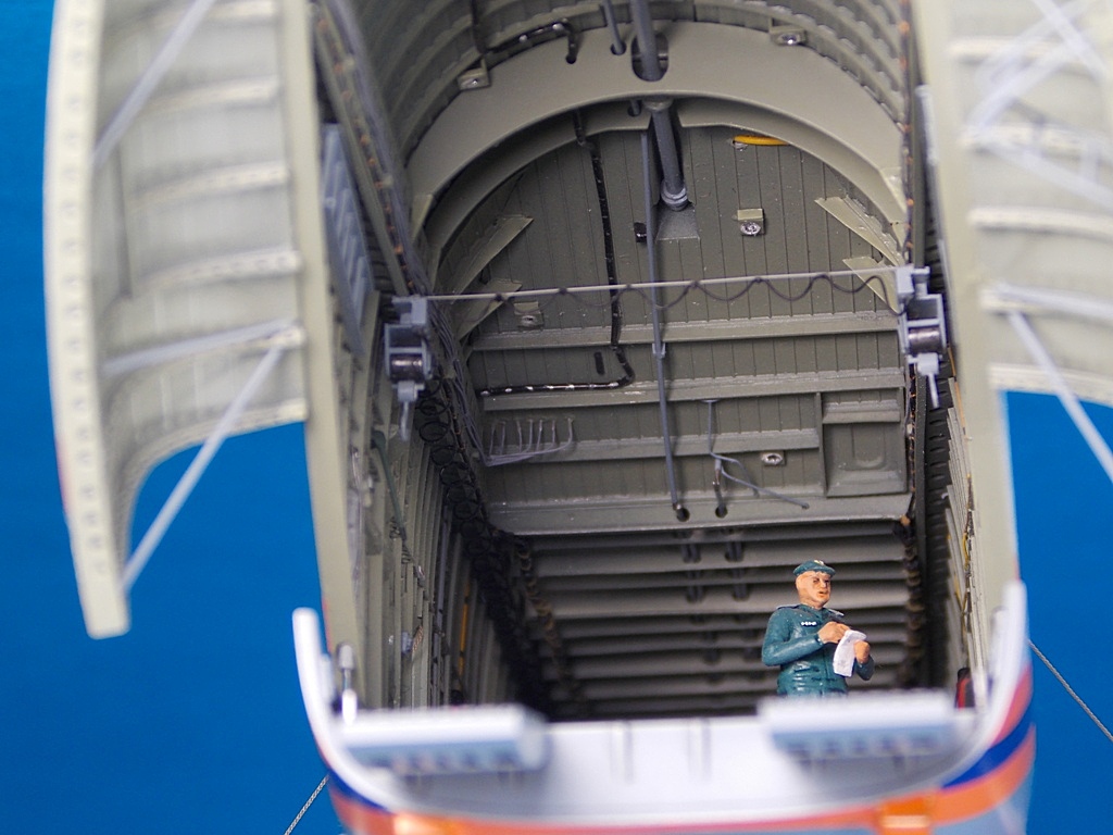 Доброго времени суток, уважаемые коллеги. Представляю Ми-26 от «Звезды». Набор оставил приятные впечатления. Из недостатков - замыленная расшивка, утяжины на трапах и в верхней части фюзеляжа, при сборке - ступенька 1 мм возникшая по бортам хвостовой балки при стыковке хвостовой части. В работе использовалась декаль от «Бегемота». Выбор пал на борт МЧС, базирующийся в Красноярске и носящий имя полковника Вакиля Махмутова, командира отдельного вертолётного отряда МЧС. Правда этот борт имеет боковое остекление кабины пилотов в виде блистера, а в наборе остекление плоское. Этот момент исправлять я не стал. Декаль богатая и качественная, однако, синяя краска слегка растворяется при использовании MicroSOL, оставляя на модели разводы, которые в прочем, легко удалились. Мелочь, но неприятно. Решил открыть створки грузового отсека, но оставлять его так, как даёт производитель, не хотелось, слишком бедно. Немного поднял рельеф силового набора, используя листовой пластик, по фото из сети доработал интерьер. В результате время работы над моделью увеличилось вдвое. Для оживления картины и восприятия размеров грузового отсека, взял фигурку из Эдуардовского набора авиатехников, и сделал офицера МЧС. В экстерьере заменил почти все мелкие детали на самодельные, из тонкого пластика и медной проволоки, поручни трапов – полиэфирная нить. Несущий и рулевой винты воспроизведены в наборе очень точно, добавил лишь проводку, контурные огни и сточил задние кромки. Нарастил на 1,5 мм ось несущего винта, т.к. лопасти задевали хвостовую балку. Окраска водорастворимый АКАН, лак глянцевый HUMBROL, смывка акварель, немного попачкал брюхо маслом. Не всё получилось так, как хотелось. Оранжево-синяя полоса на фюзеляже съехала вниз на 1,5 мм, цвет внутренних поверхностей грузового отсека слишком ушёл в зелёный (мешал сам), в окраске есть шагрень. Пожалуй, всё. Всех с наступающим праздником! С Днём Великой Победы!