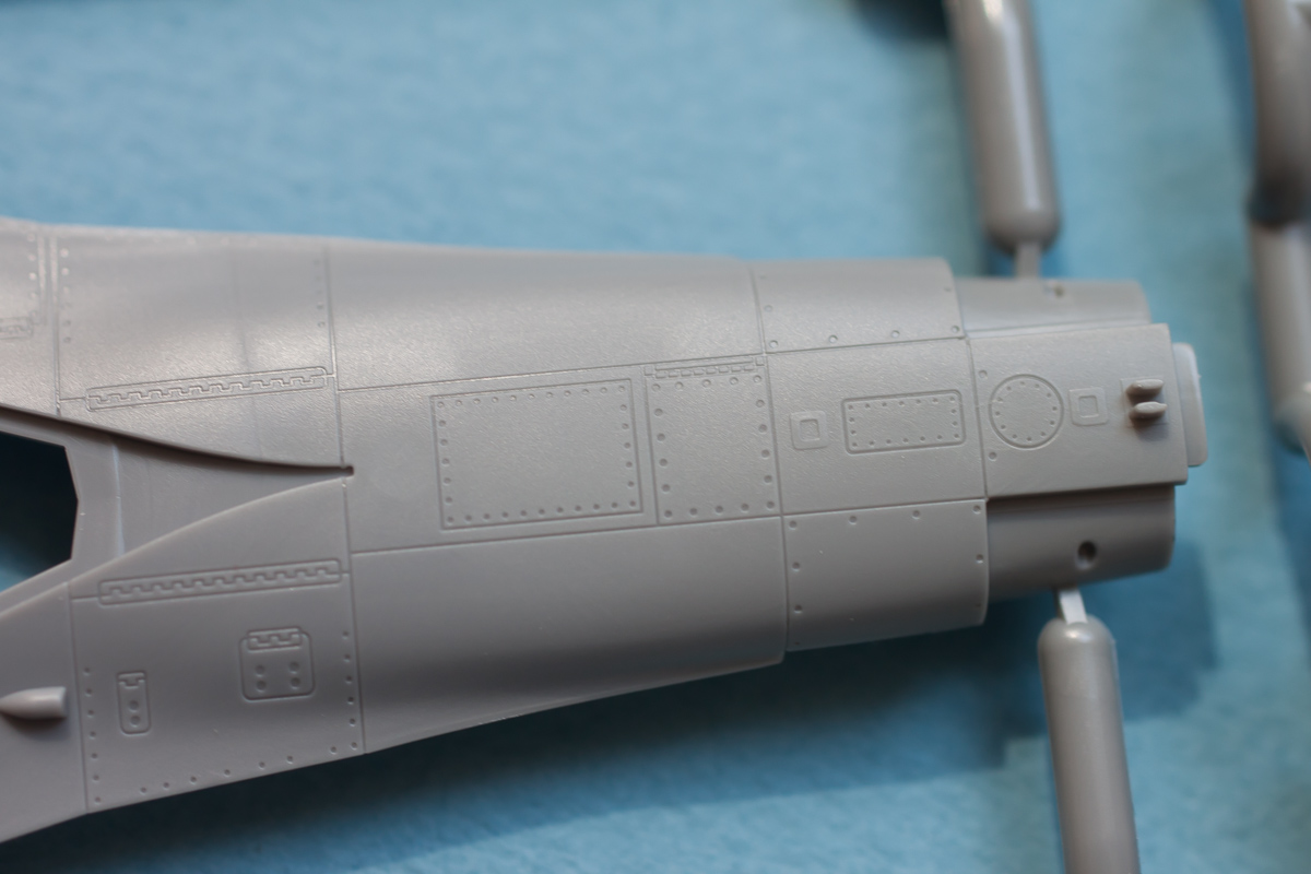 Стоит упомянуть главную особенность набора - это почти полное отсутствие подвесного вооружения, предусмотрено только две точки подвески ракет на законцовках крыльев, но членение модели недвусмысленно намекает, что ожидается пополнение в семействе другими модификациями, и там, надеюсь, с вооружением будет все хорошо, тем более в сети были скриншоты 3D модели со всем возможным обвесом. Кстати на листе с декалями предусмотрено элементы и для подвесных баков и для различных контейнеров.